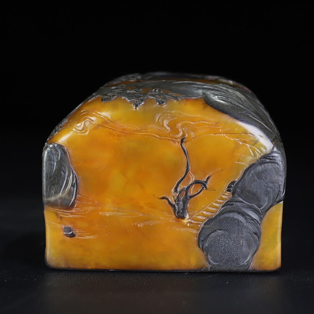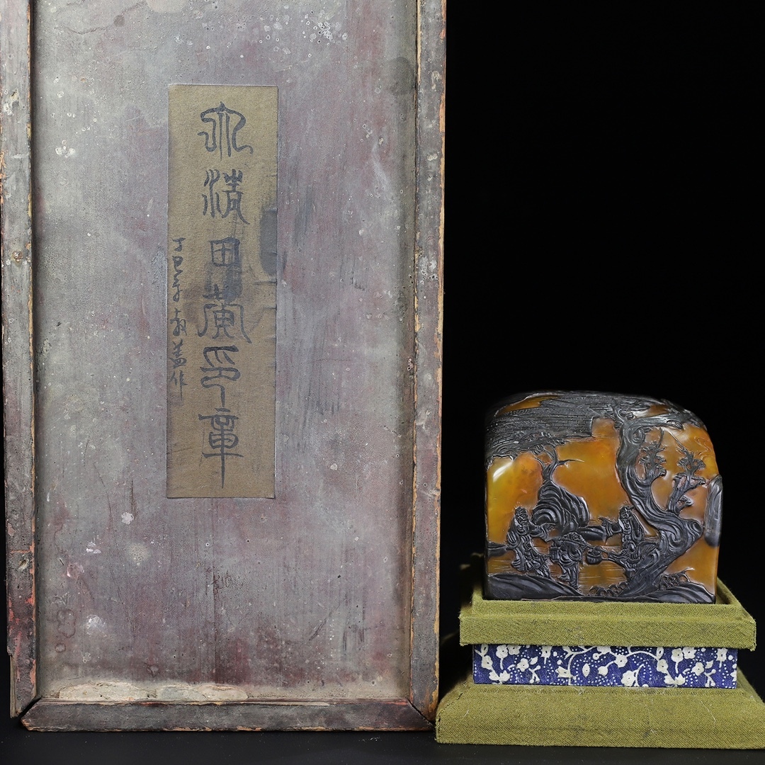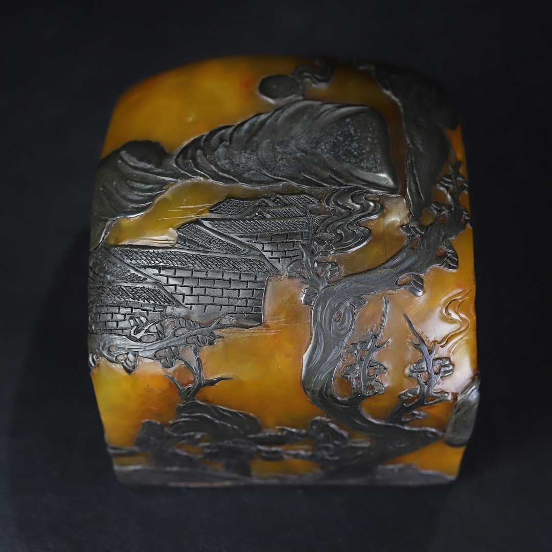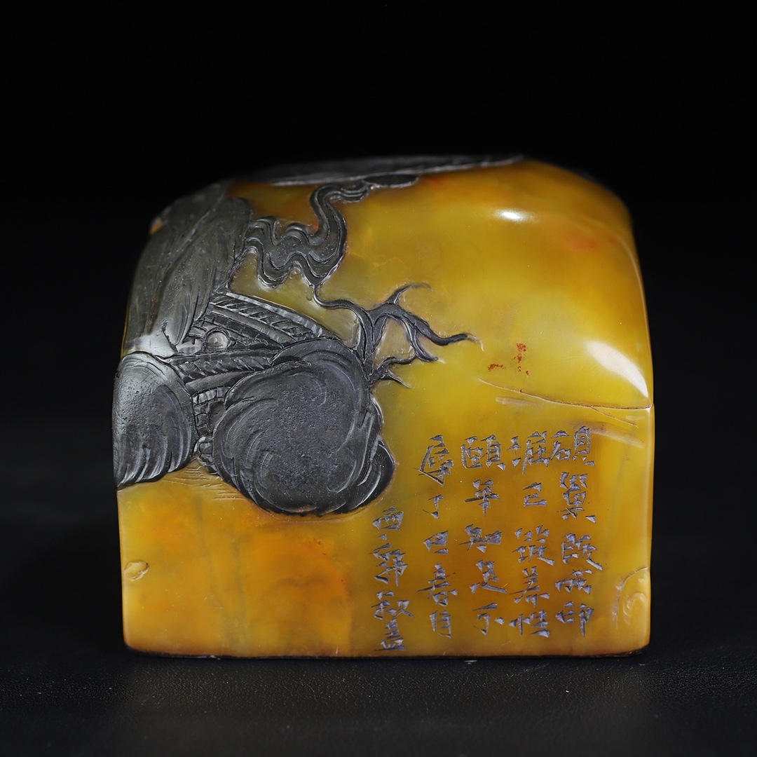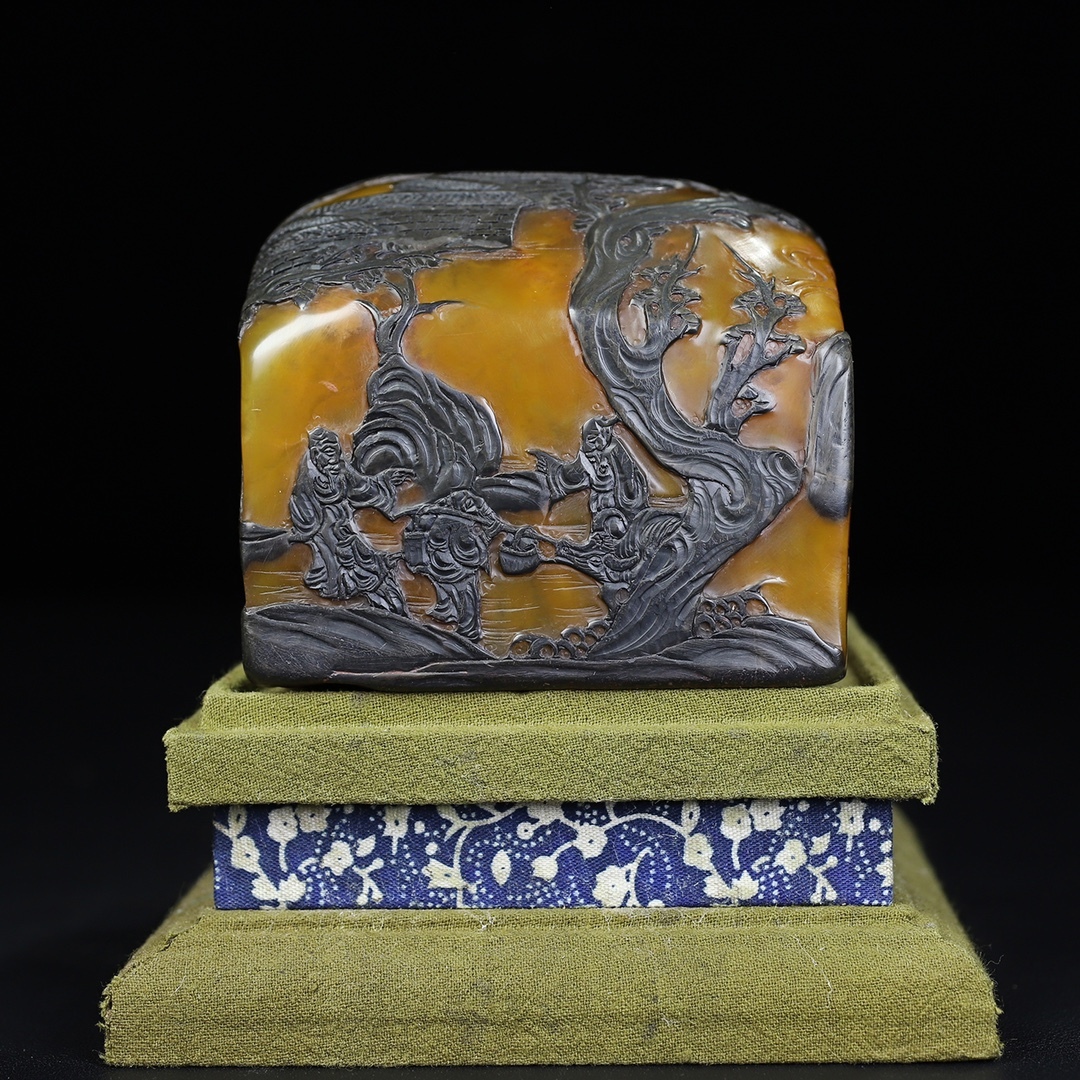 唐物 【清代篆刻家 郭叔蓋】寿山石 烏皮微彫『走親訪友』人物紋 薄意印鑑 天然石 手彫 篆刻 古印材 極細工 中国古玩 骨董品 古美味 D68