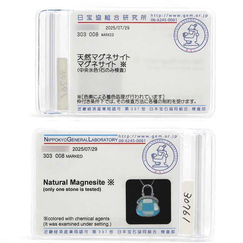 | ソーティング記載 | 天然マグネサイト マグネサイト※ (中央水色1石のみ検査) ※[色素による着色処理が行われています] |