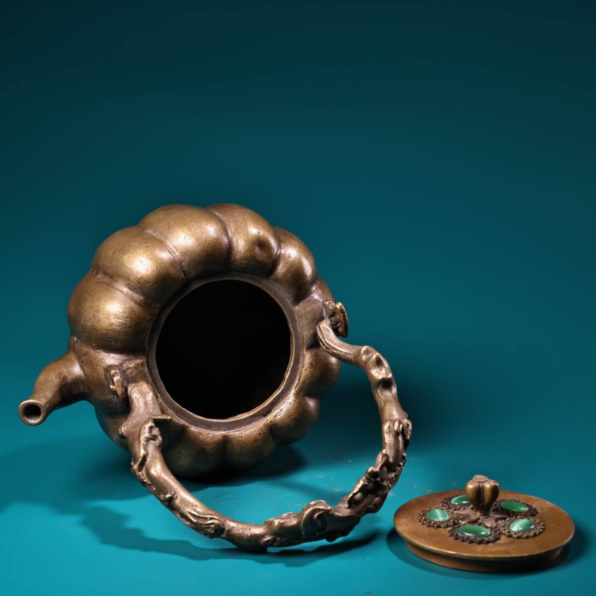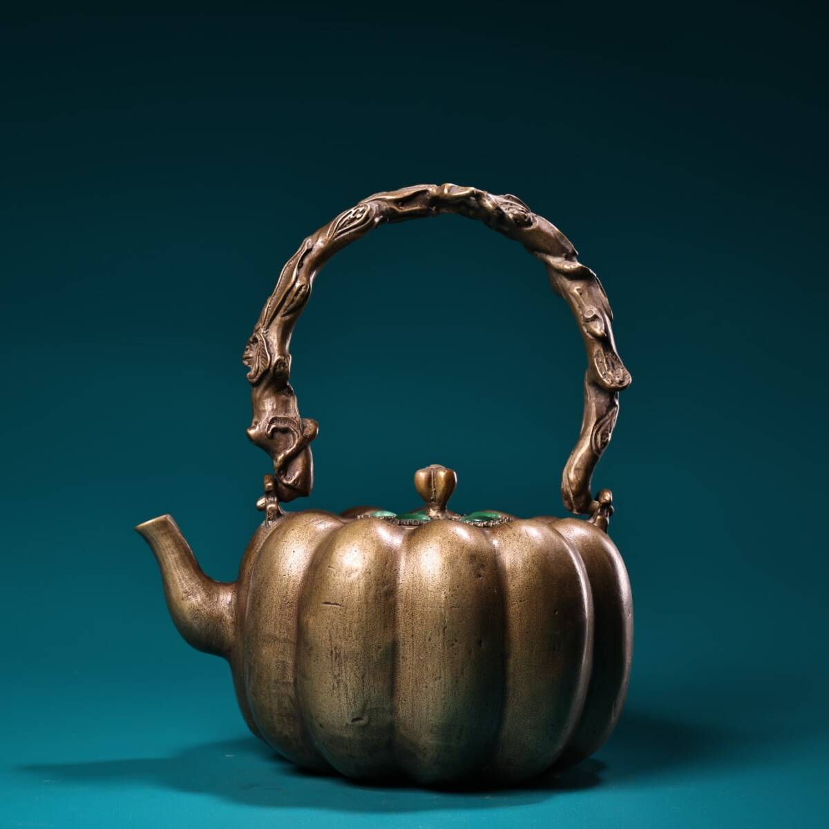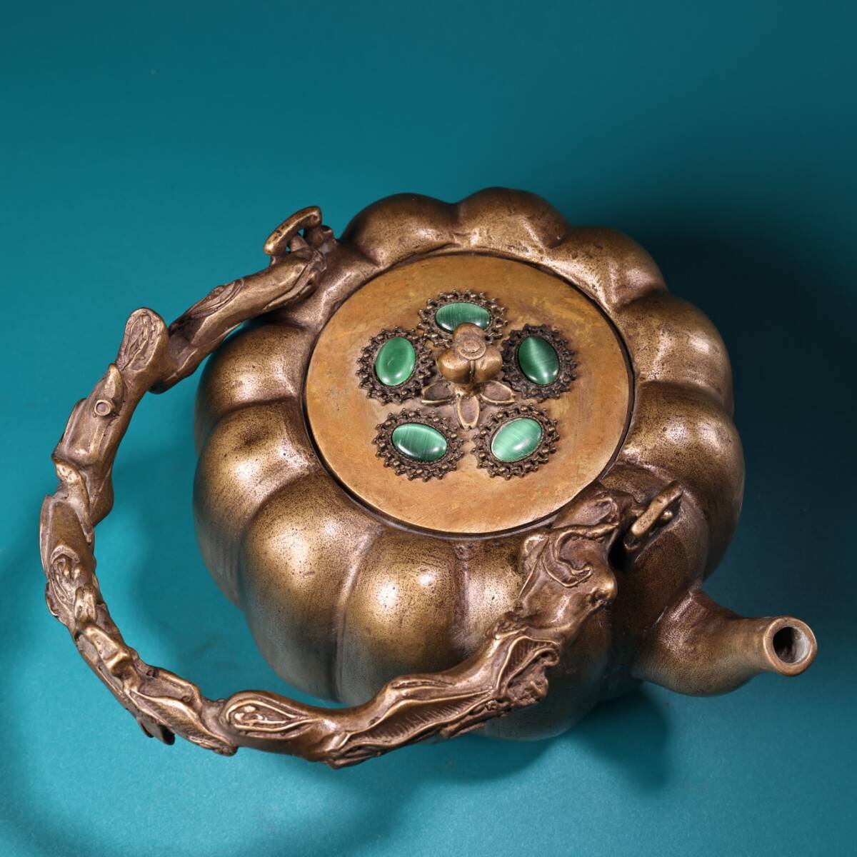 收藏 古銅彫 嵌宝石 銅器 南瓜壺 提梁壺 急須 茶壺 煎茶道具 茶道具 文案置物 擺件 時代物 古董品 骨董 旧家蔵出し 唐物 中国古玩 古美術品