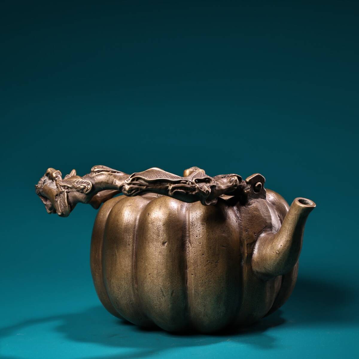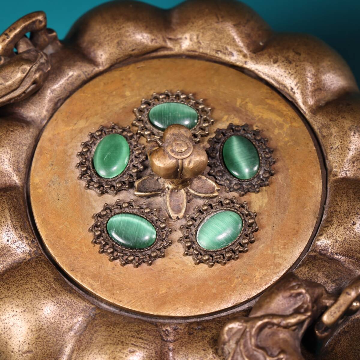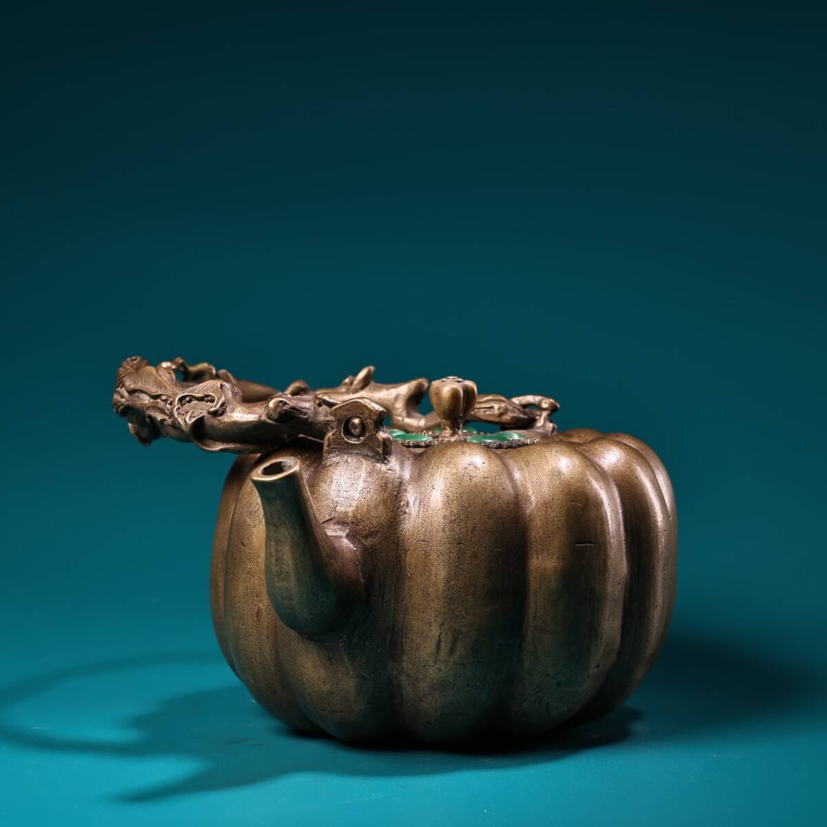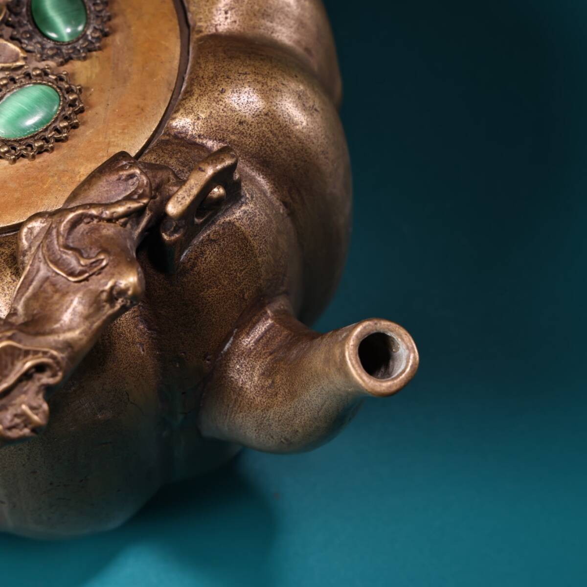 收藏 古銅彫 嵌宝石 銅器 南瓜壺 提梁壺 急須 茶壺 煎茶道具 茶道具 文案置物 擺件 時代物 古董品 骨董 旧家蔵出し 唐物 中国古玩 古美術品
