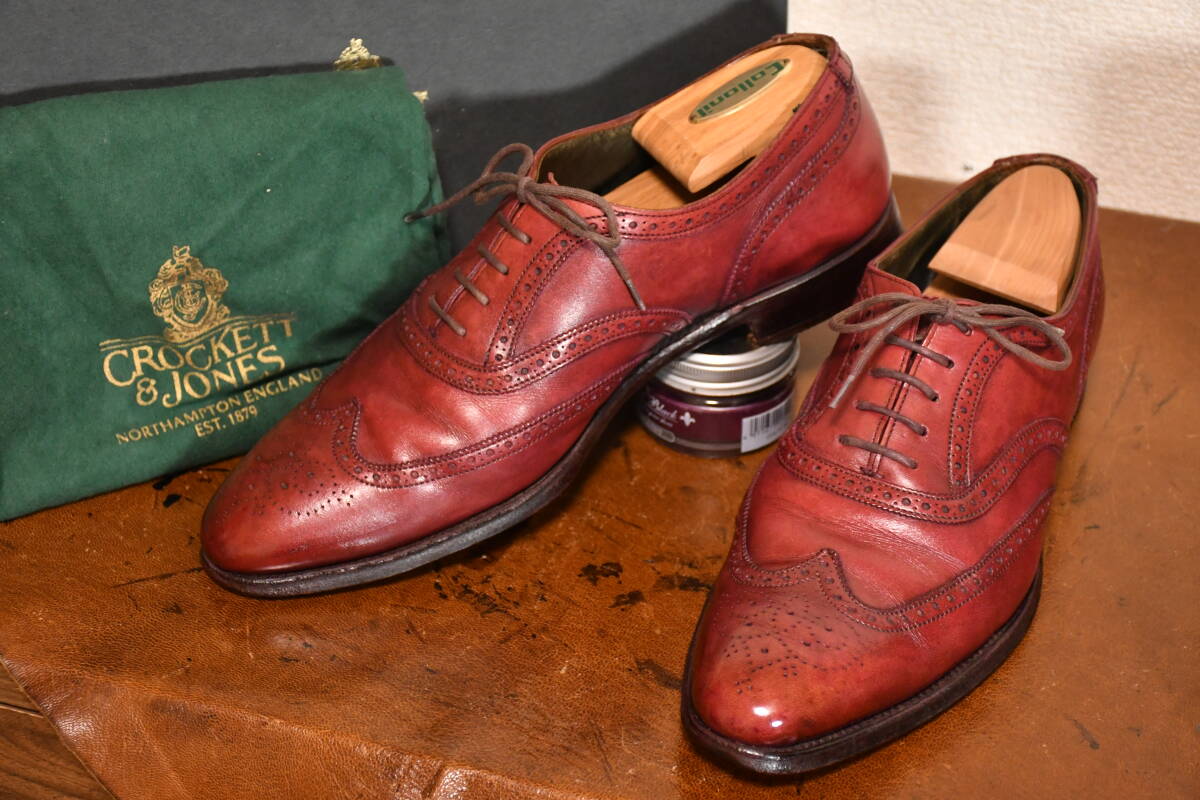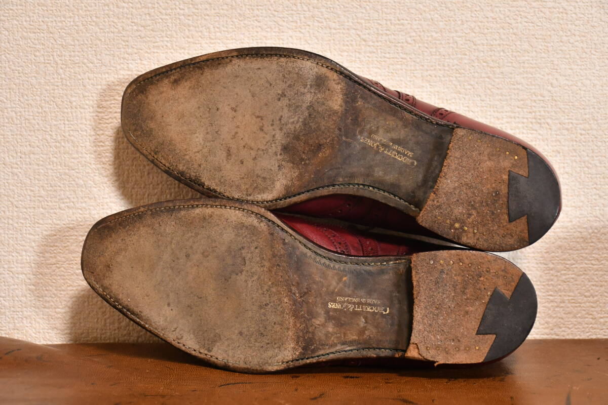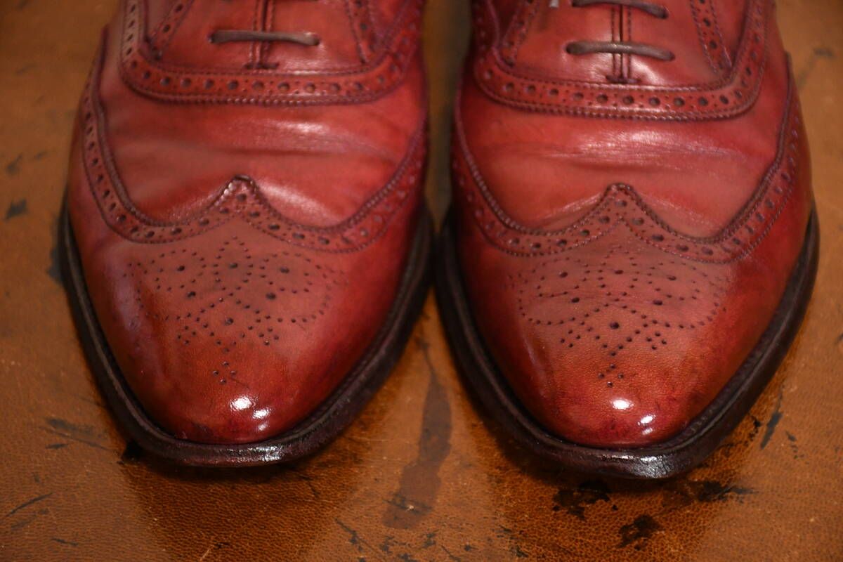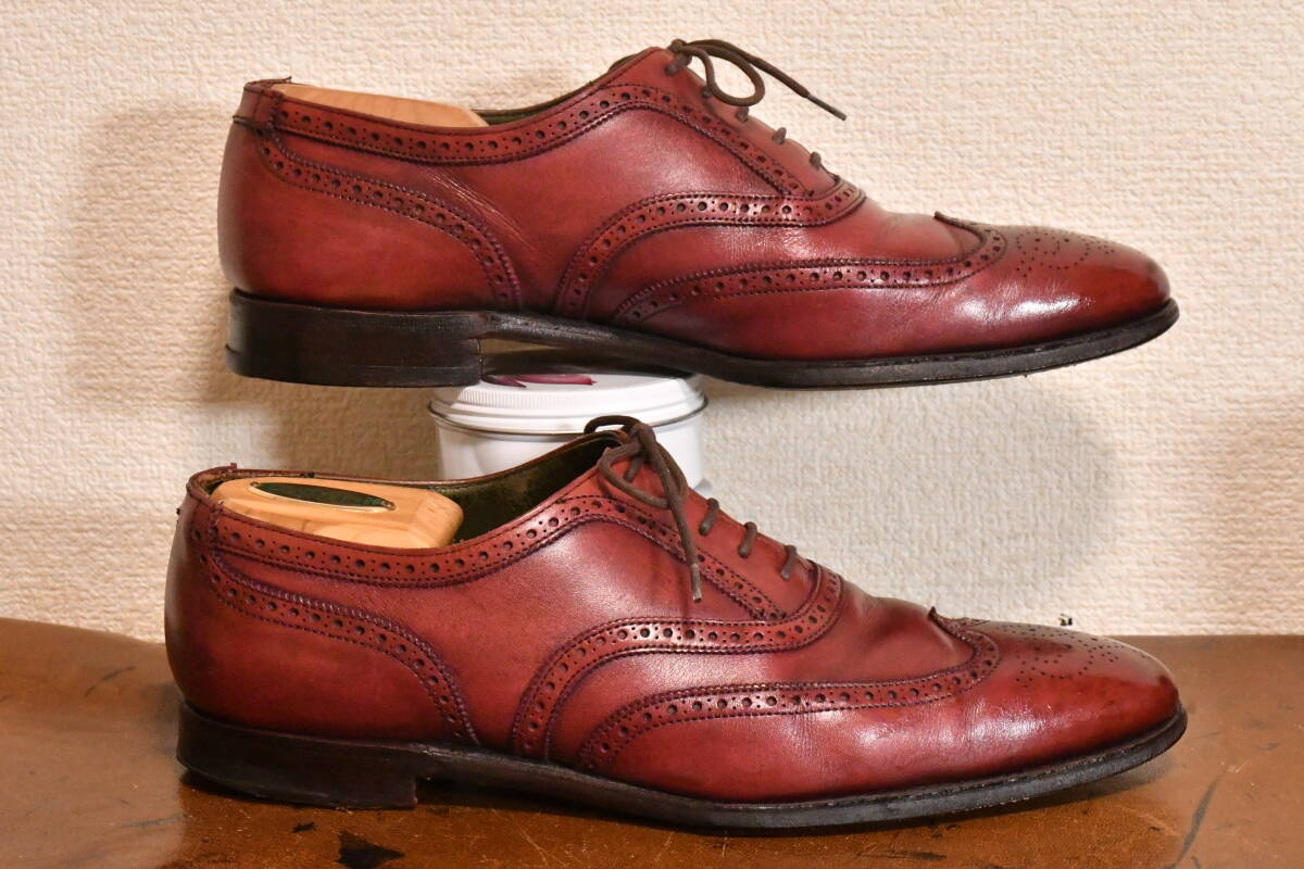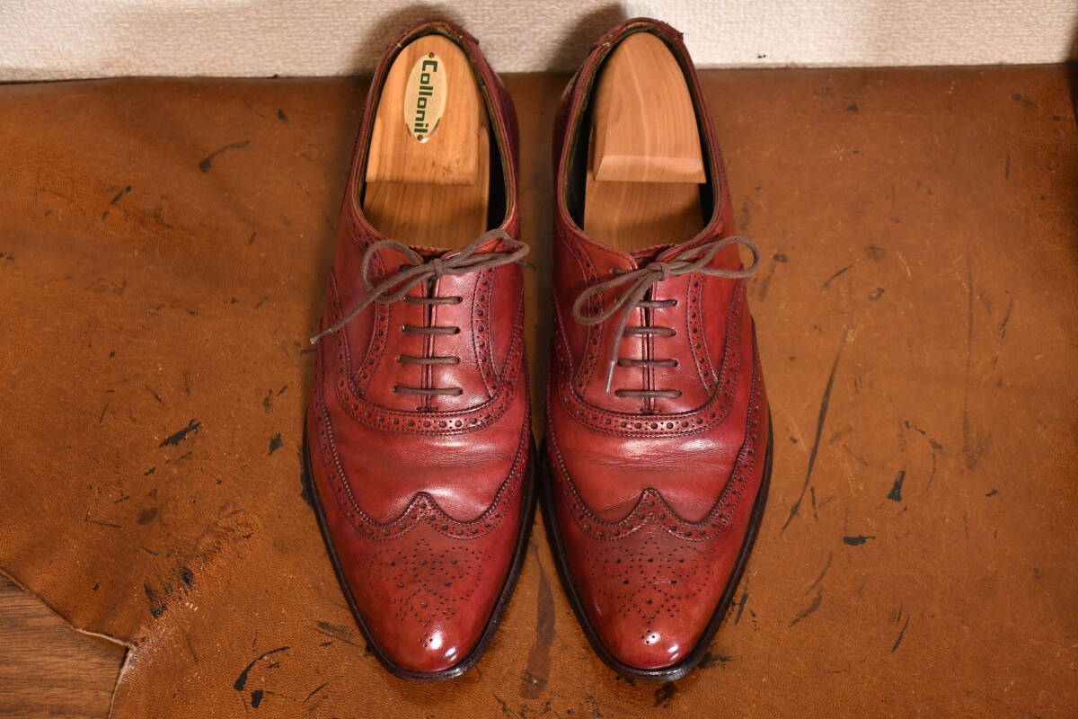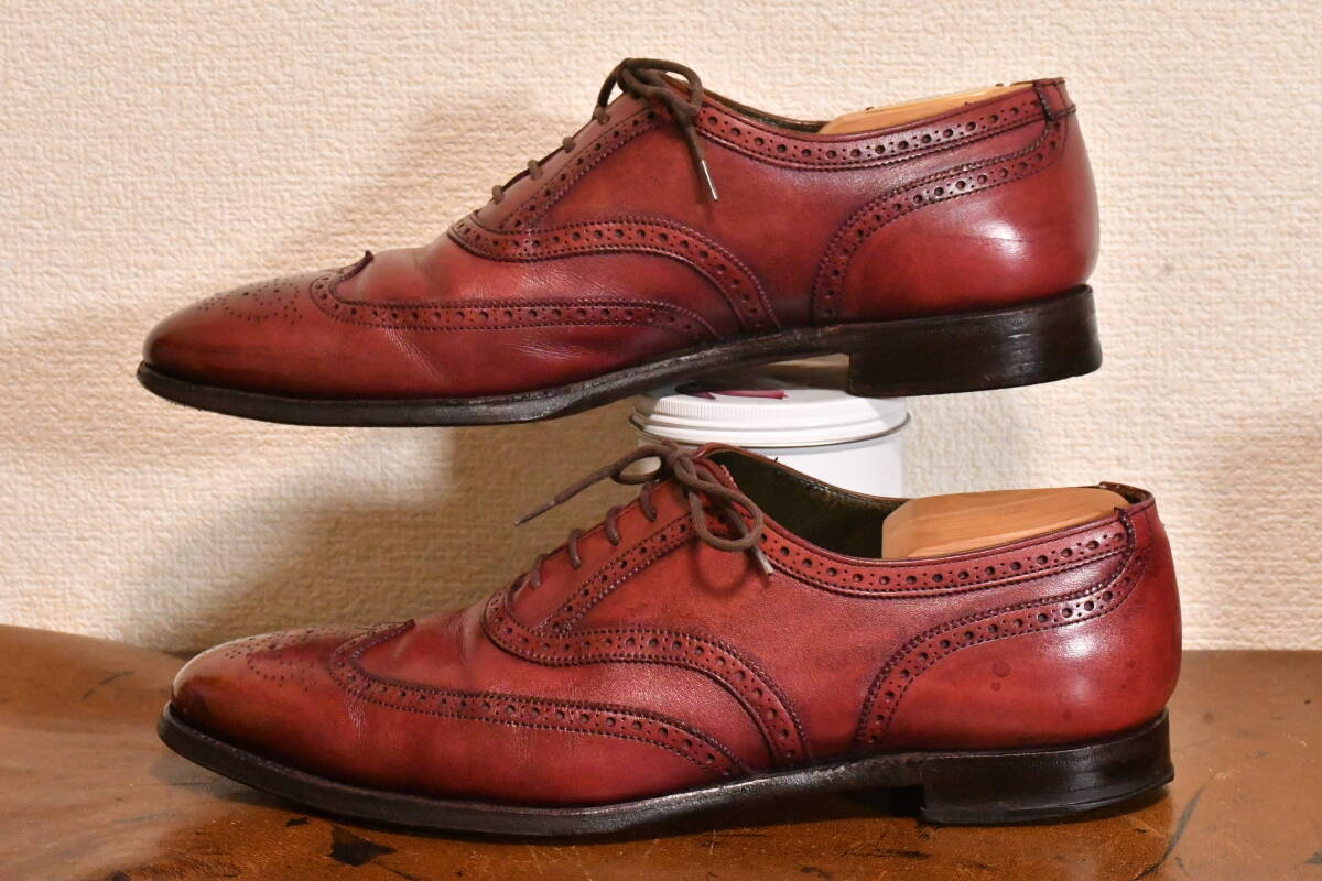 アッパーはバーガンディに近い茶で、ややむら感もあり色気のあるペアです。デニムと合わせて綺麗目にまとめたり、セットアップの外しにしたり、いろいろと楽しめるのではないでしょうか。