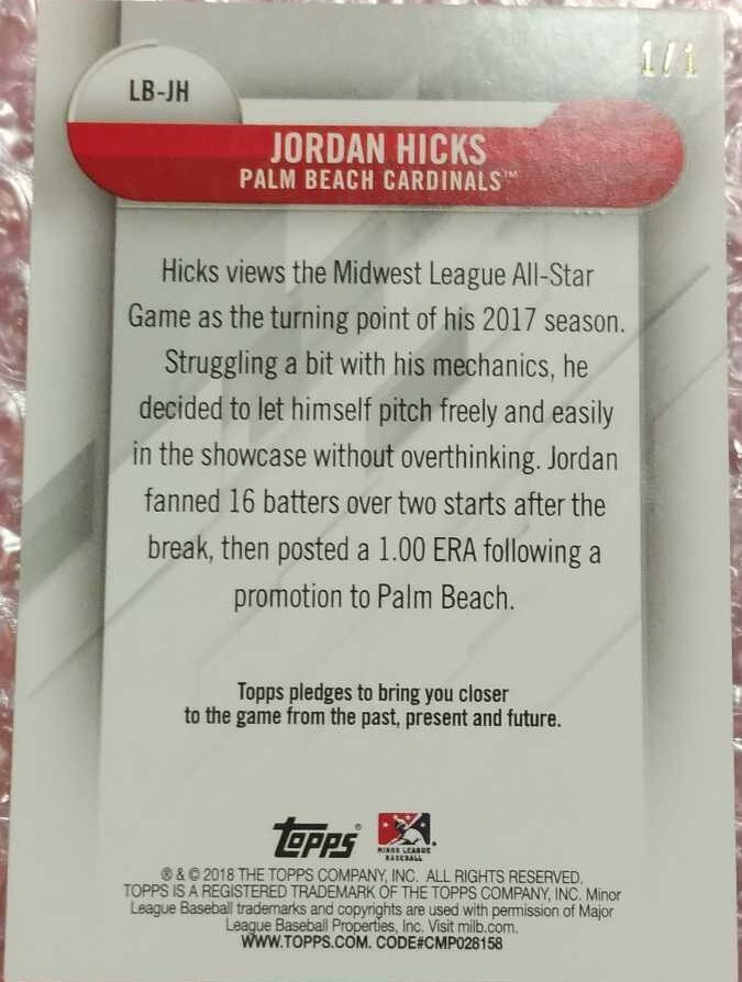 2018 トップス プロデビュー から出たジョーダン・ヒックスの世界に一枚しかないカードです。