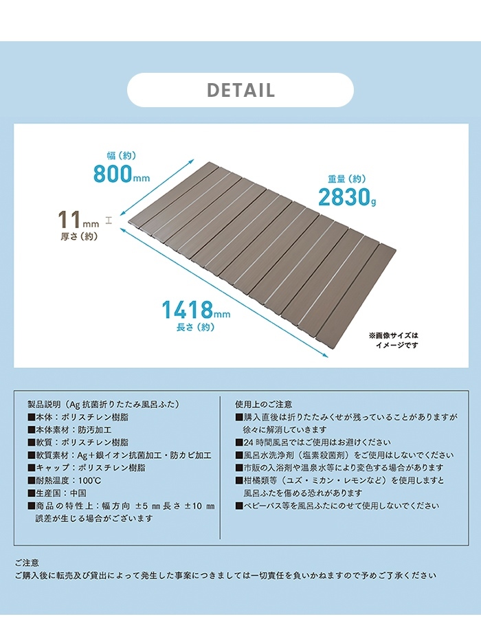 | [製品寸法]幅80×厚さ1.1×長さ141.8cm ※製品の特性上、実際の寸法は幅・長さともに若干の誤差が生じる場合がございます。〈幅±5mm、長さ±10mm〉 [バスタブ適用サイズ]80×厚さ1.1×長さ140cm用 |