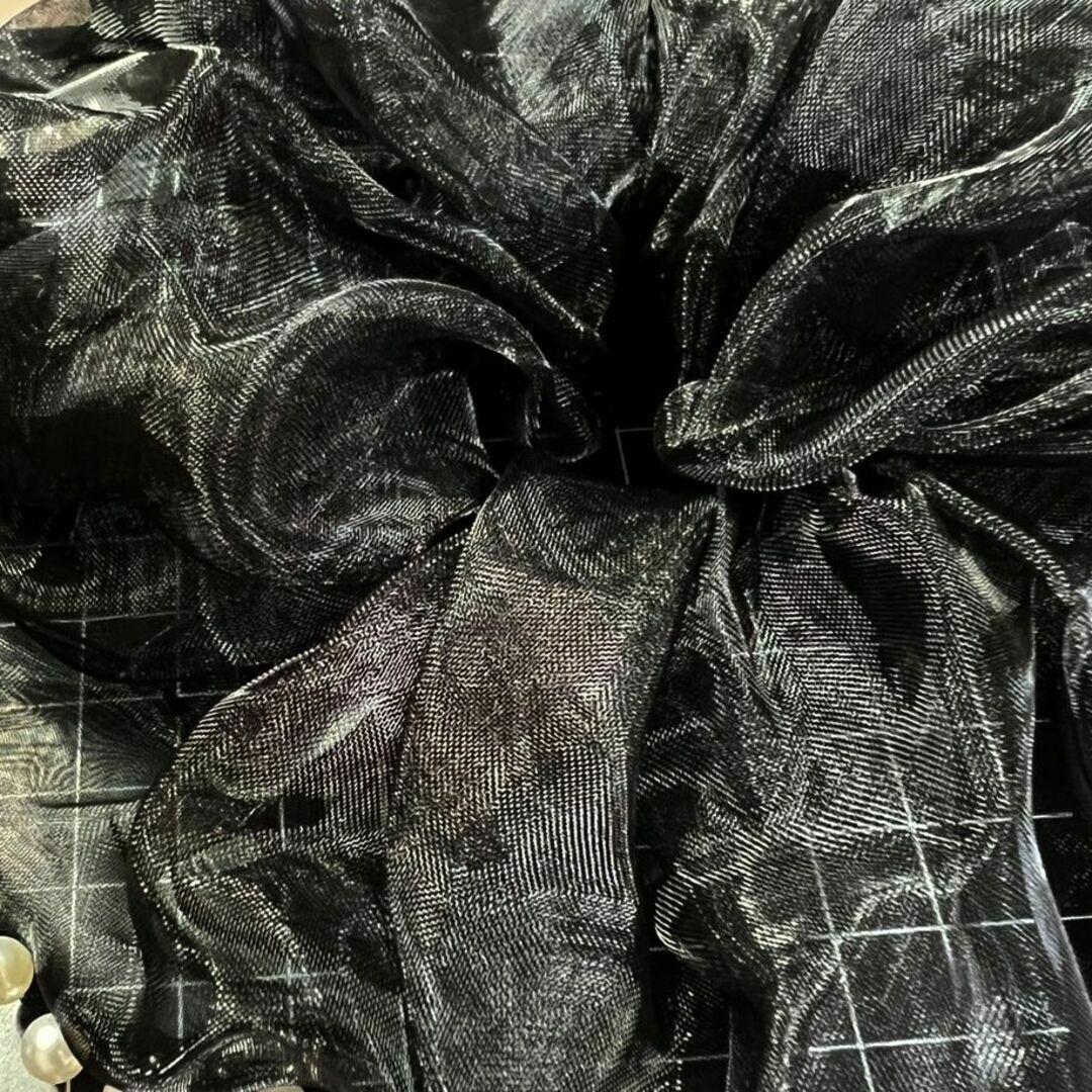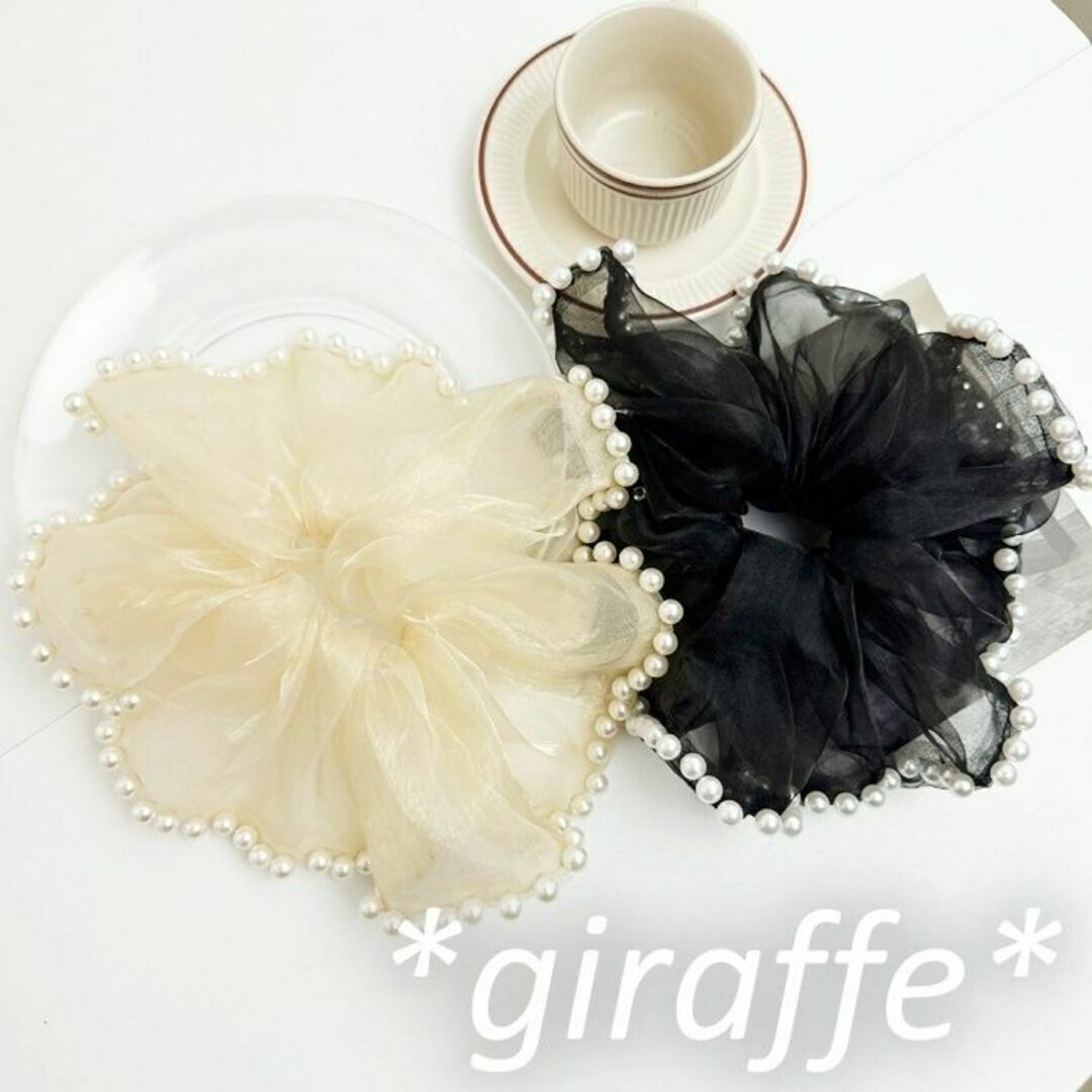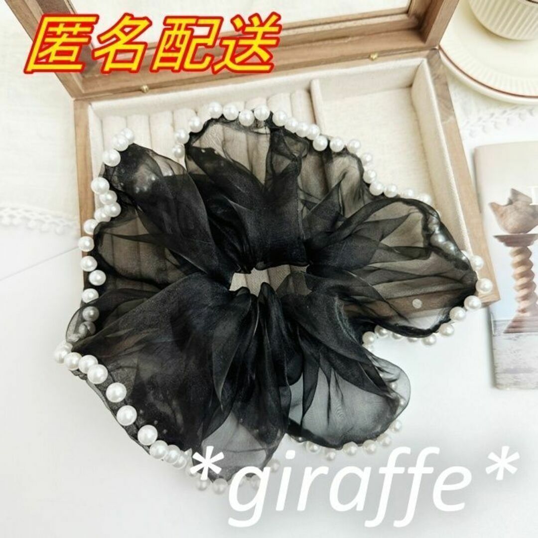 E338 匿名配送 シュシュ パール 縁取り ブラック シフォン 大きめ 髪ゴム ヘアゴム ヘアアクセサリー