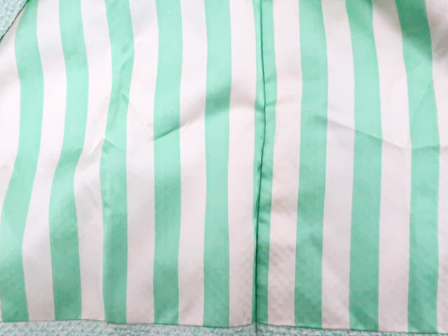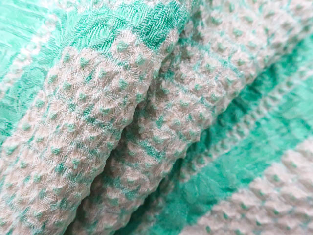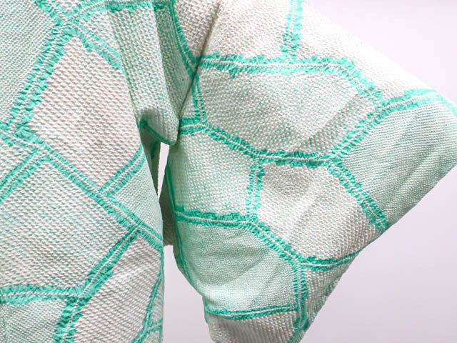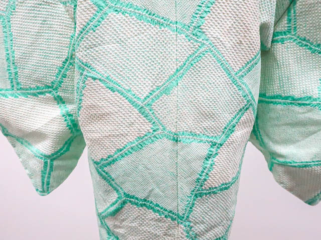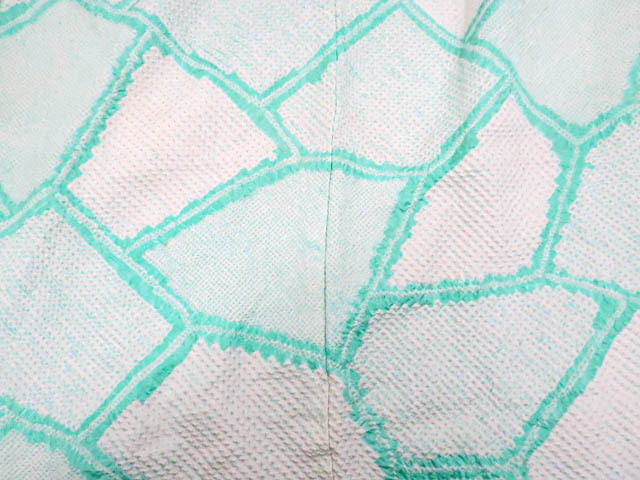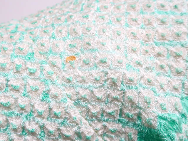 リサイクル商品のため、前身頃など所々シミがございますがご着用いただけると存じます。 地色は青緑です。 1枚目の画像が近いお色かと思われます。 素材は正絹です。 |