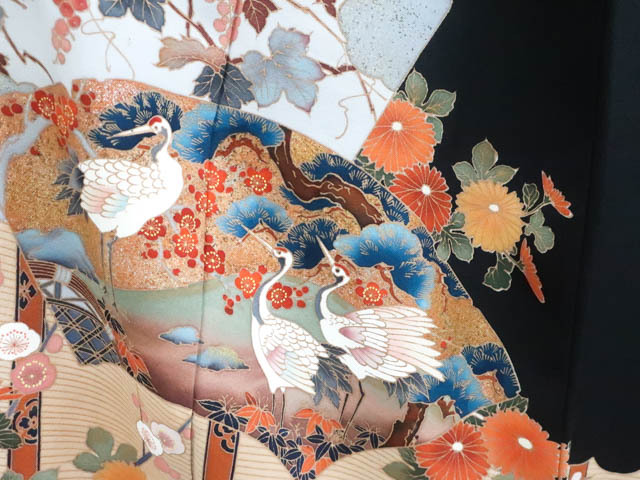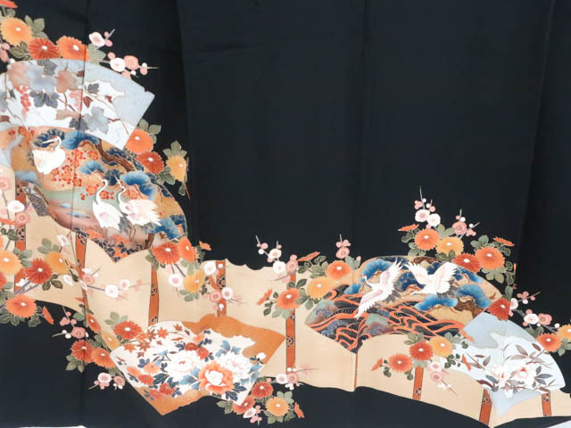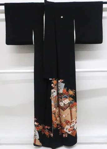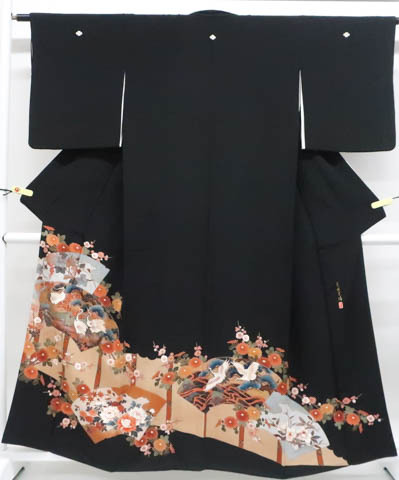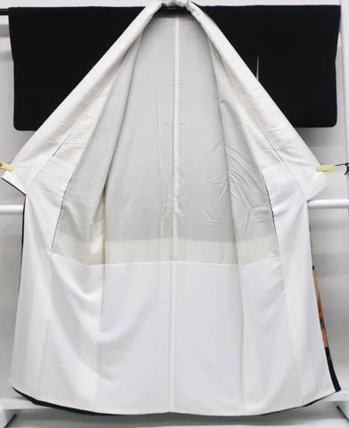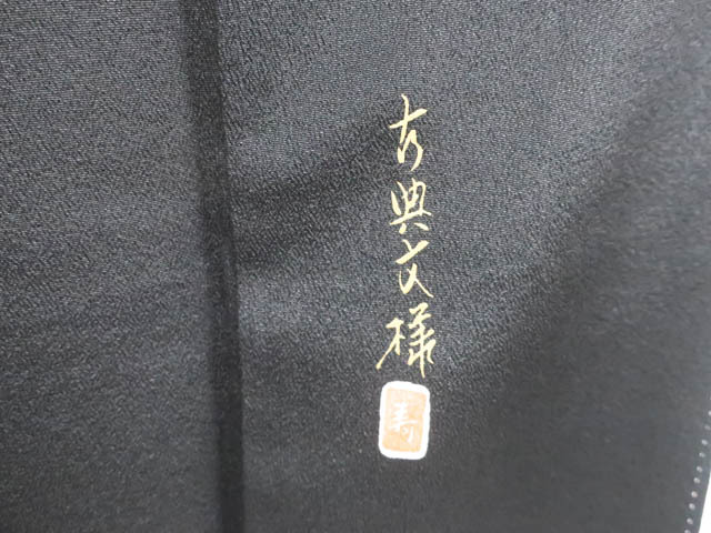 リサイクル商品のため、裏表所々しみ汚れがございます。 比翼衿に糸つれがございますが着用可能なお品です。 地色は 黒です。 1枚目の画像が近いお色かと思われます。 素材は正絹です。 |