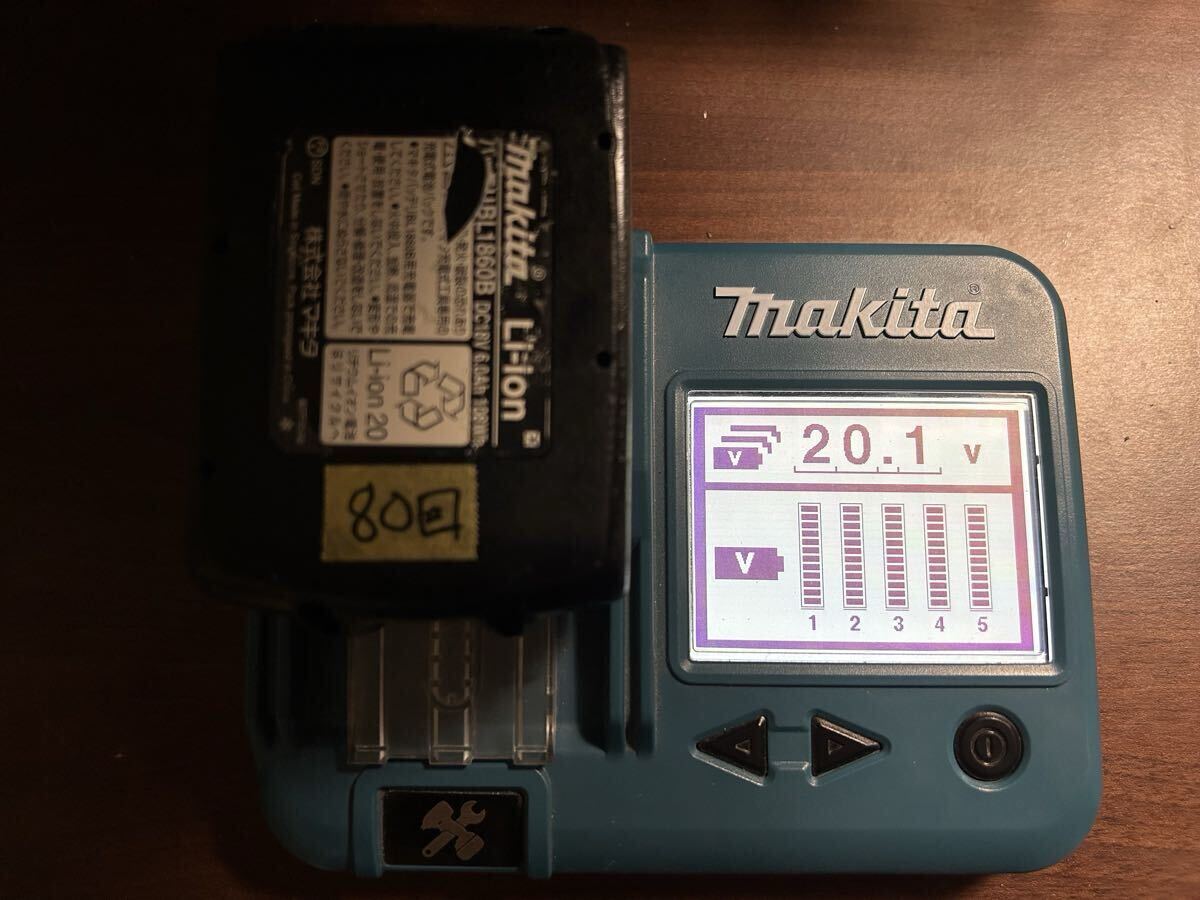 ・ マキタ純正充電器での充電電流確認&満充電時のバッテリー残量表示4点灯確認
