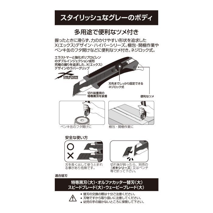 ・適応替え刃:特専黒刃(大)、オルファカッター替刃(大)、スピードブレード(大)、ウエーブブレード(大)
