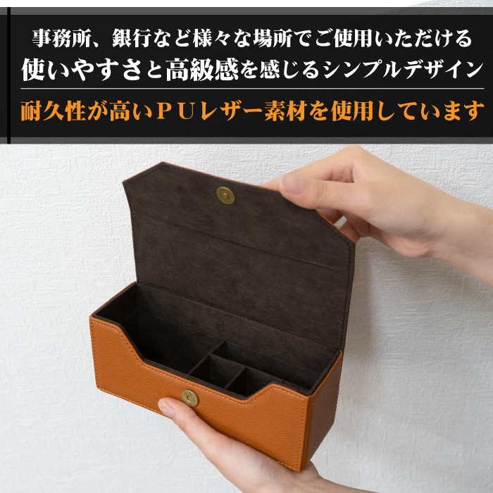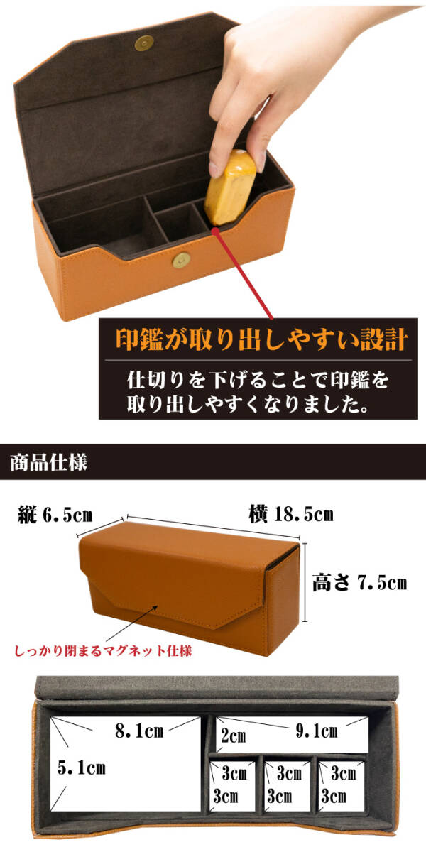 | ■生地素材:PUレザー ■カラー:ブラック 【おすすめポイント】 事務所、銀行など様々な場所でご使用いただける使いやすさと高級感を感じるシンプルデザインの印鑑ケースです。 大きいサイズの印鑑にも対応したスペースのある、法人用印鑑に適した仕切りになっております。 |