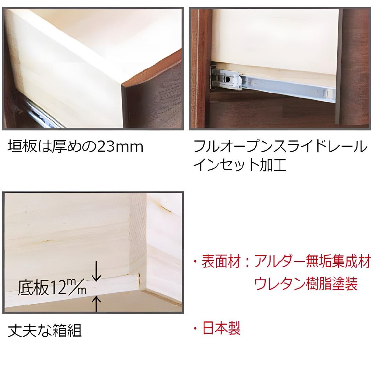 箱状の引出しを作り、そこに前板を付けた構造。(前板の内側に、もう一枚板があるような状態です)安価な家具は、引出しの側板に直接「前板」をつけたものが多い。それに比べ、箱組した引き出しは、がたつきにくく非常に強度があります。