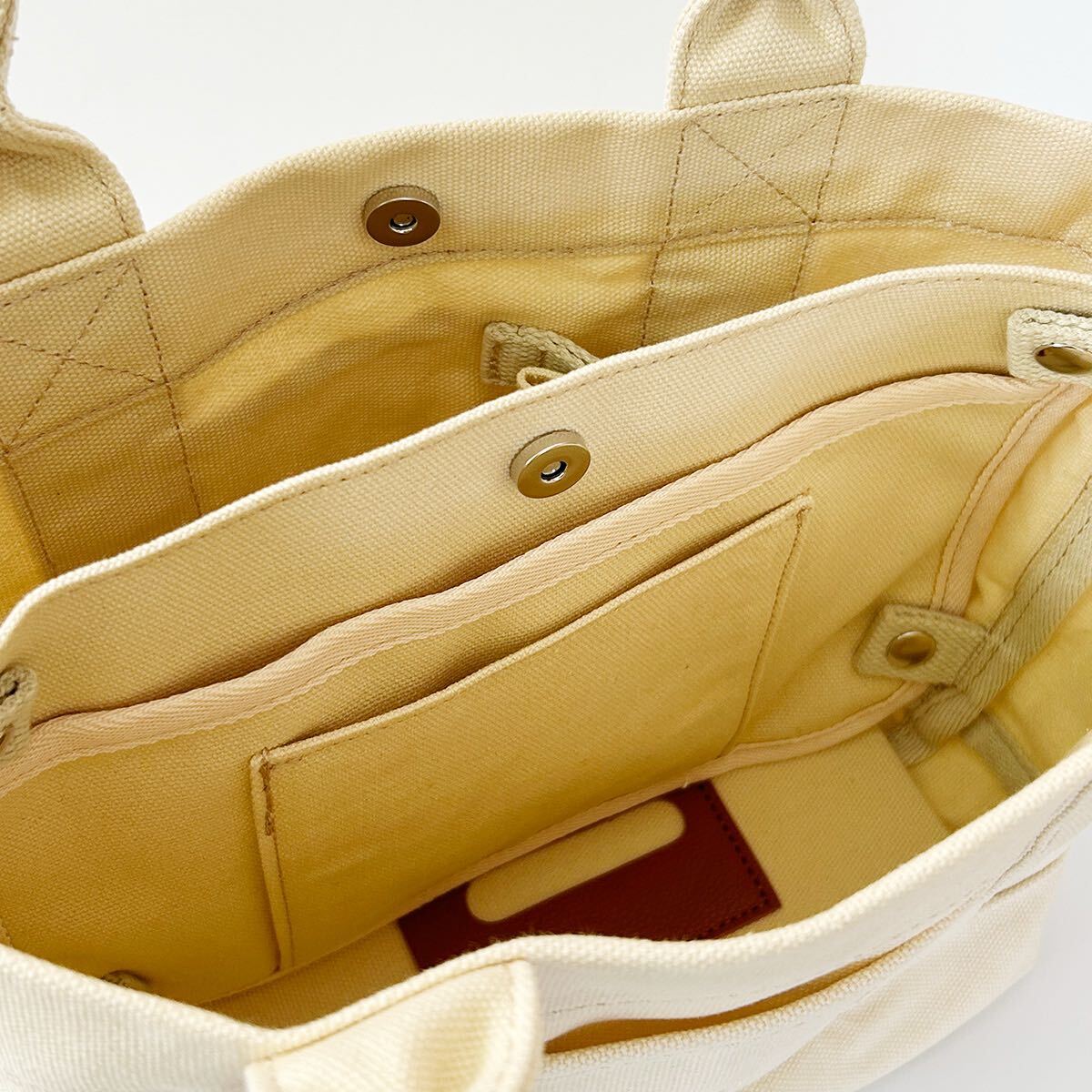 丈夫なキャンバス素材を使用することにより、長く気軽にお使い頂けます。持ち手も同生地で握りやすく荷物が重くても指への負担が軽減されます。荷物を入れていなくてもしっかり自立します。