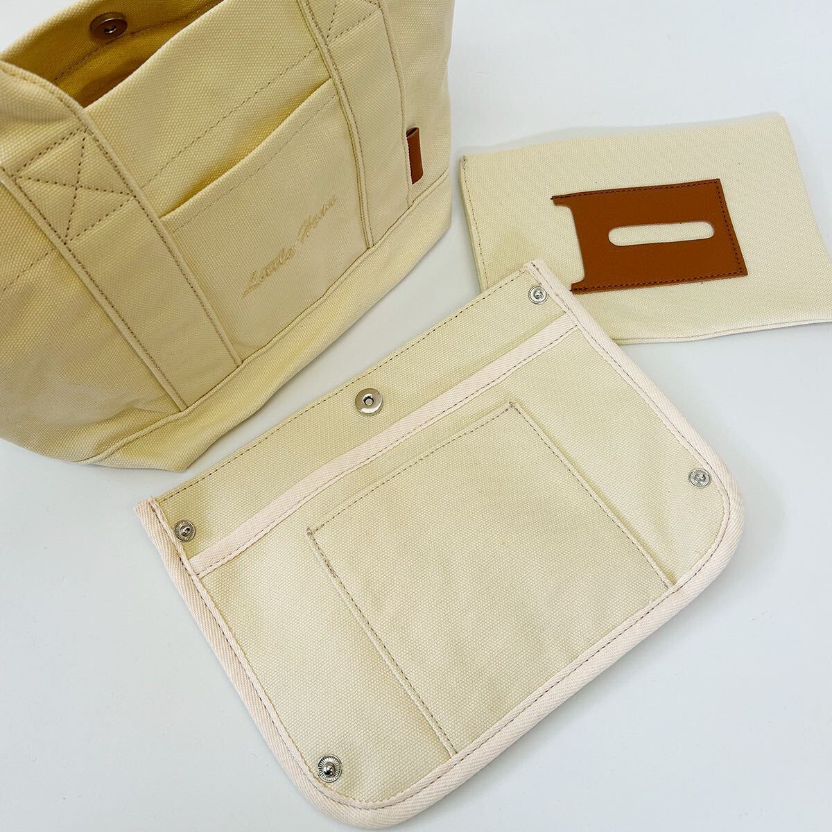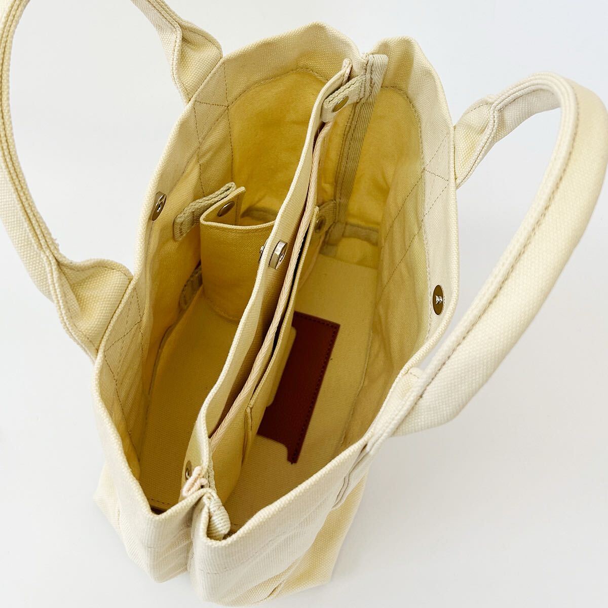 3つの仕切りで中に何が入っているか一目でわかる!お弁当など、かさばる荷物が多い日は仕切りを取り外して、普通のトートバックに変身。底板が入っているので沢山荷物を入れても安定して自立します。