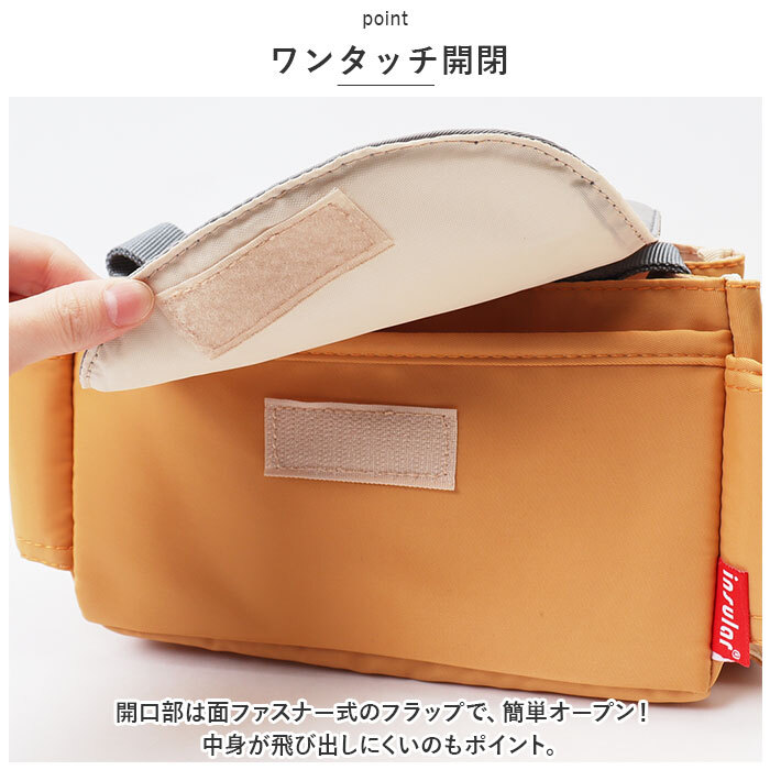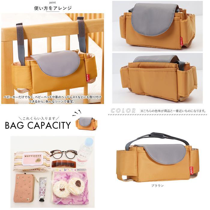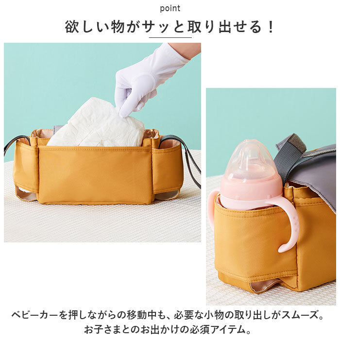 商品説明 | ・・赤ちゃんのケアグッズをひとまとめに!ベビーカーに吊り下げることができて、お出掛けに便利な「ベビーカーバッグ」が新登場。 ・【欲しい物がサッと取り出せる!】 ・ベビーカーを押しながらの移動中も、必要な小物の取り出しがスムーズ。お子さまとのお出かけの必須アイテム。 ・【ベビーカーに取り付け可能】 ・両サイドの面ファスナー式ベルトを使って、ベビーカーにラクラク取り付け。持ち運びしやすい、軽量でソフトな質感。 ・【ワンタッチ開閉】 ・開口部は面ファスナー式のフラップで、簡単オープン!中身が飛び出しにくいのもポイント。 ・【すっきり整理整頓】 ・メインルームは2スペースに仕切られており、おむつやおしり拭きなどを収納できるサイズ感。仕切りは面ファスナーで着脱可能。 ・【哺乳瓶や小物を収納できるポケット】 ・両サイドのポケットには、哺乳瓶やボトル類をIN。フラップ内側のフロントポケットとバックポケットには小物を収納。 ・【うれしい撥水性をプラス】 ・サラッとしたナイロン素材を使い、汚れや水をはじく撥水加工済み。お手入れも拭き取るだけでOK。(※完全防水ではありません。) ・【使い方をアレンジ】 ・ベビーカーだけでなく、ベビーベッドや車のヘッドレストなどにも取り付けできるから、色んなシーンで重宝。 ・【選べるカラー】 ・温かみのあるバイカラーをラインナップ。パパ・ママが持ちやすい、シンプルな無地デザイン◎ ・【ポケット仕様】 ・前面(フラップ内):オープンポケット×1 ・サイド:オープンポケット(ボトルポケット)×2 ・背面:オープンポケット×1 |