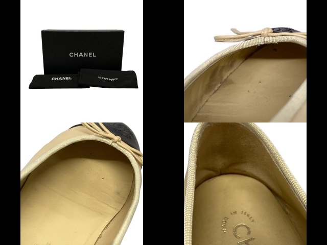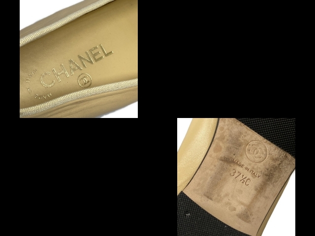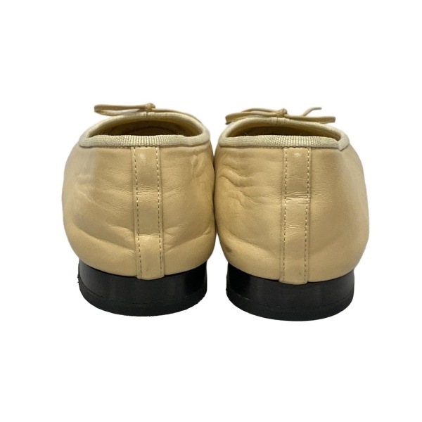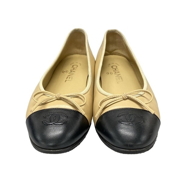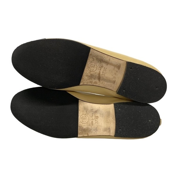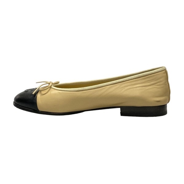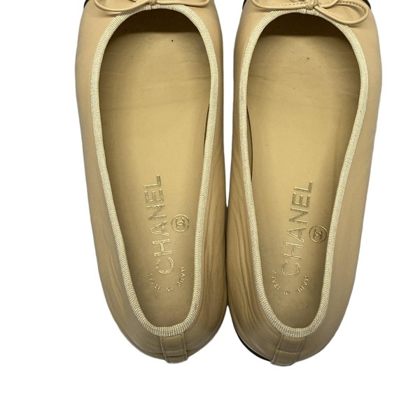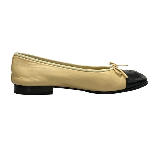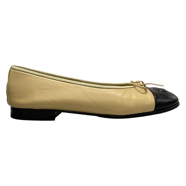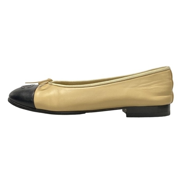 シャネル CHANEL フラットシューズ 37 1/2 C G02819 - ラムスキン ベージュ×黒 レディース リボン/ココマーク/アウトソール張替済 靴