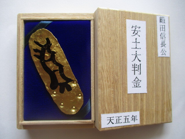 安土大判金は織田信長公が安土城に入城した天正四年(1576年)より鋳造されました。江戸時代の大判金より古い室町大判金・安土大判金・桃山大判金の三種をまとめて、歴史家には「先三代大判金」と呼ばれています。