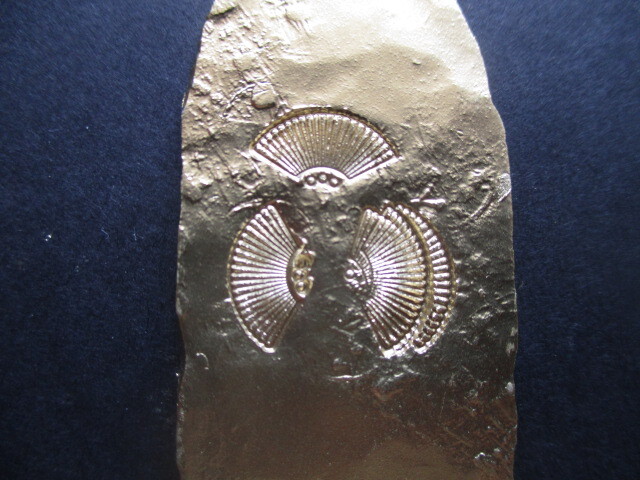 コレクター放出品です。表には信長公の花押(サイン)「麒麟」が描かれています(3枚目の画像)。また、端に数個の小正円が刻まれ、その数によって発行年が特定できるそうです。裏には安土小判金と同様の「扇面」(5枚目の画像)と「新世紀旭日」(6枚目の画像)が刻まれていますが、さすがに小判金よりは手が込んでいます。汚れや細かな傷があります。撮影の際の光の量によって実物と違った色に写ることがあります(2枚の画像が最も実物の色に近いように思います)。これまで一度も鑑定に出したことがなく、正真正銘の真贋不明ですが、トラブル防止のためあえてレプリカとして出品させていただきます。また、金品位を記載した保証書が付属しませんので非金製品として出品させていただきます。ご納得いただける方のみご入札ください。木箱(縦約11㎝、横約8.2㎝)は商品に含まれますが、大判金一覧表は含まれません。自己紹介欄にオークション休業日を記載させていただいております。お手数とは存じますが、ご入札前にお読みいただければ幸いです。よろしくお願い申し上げます。