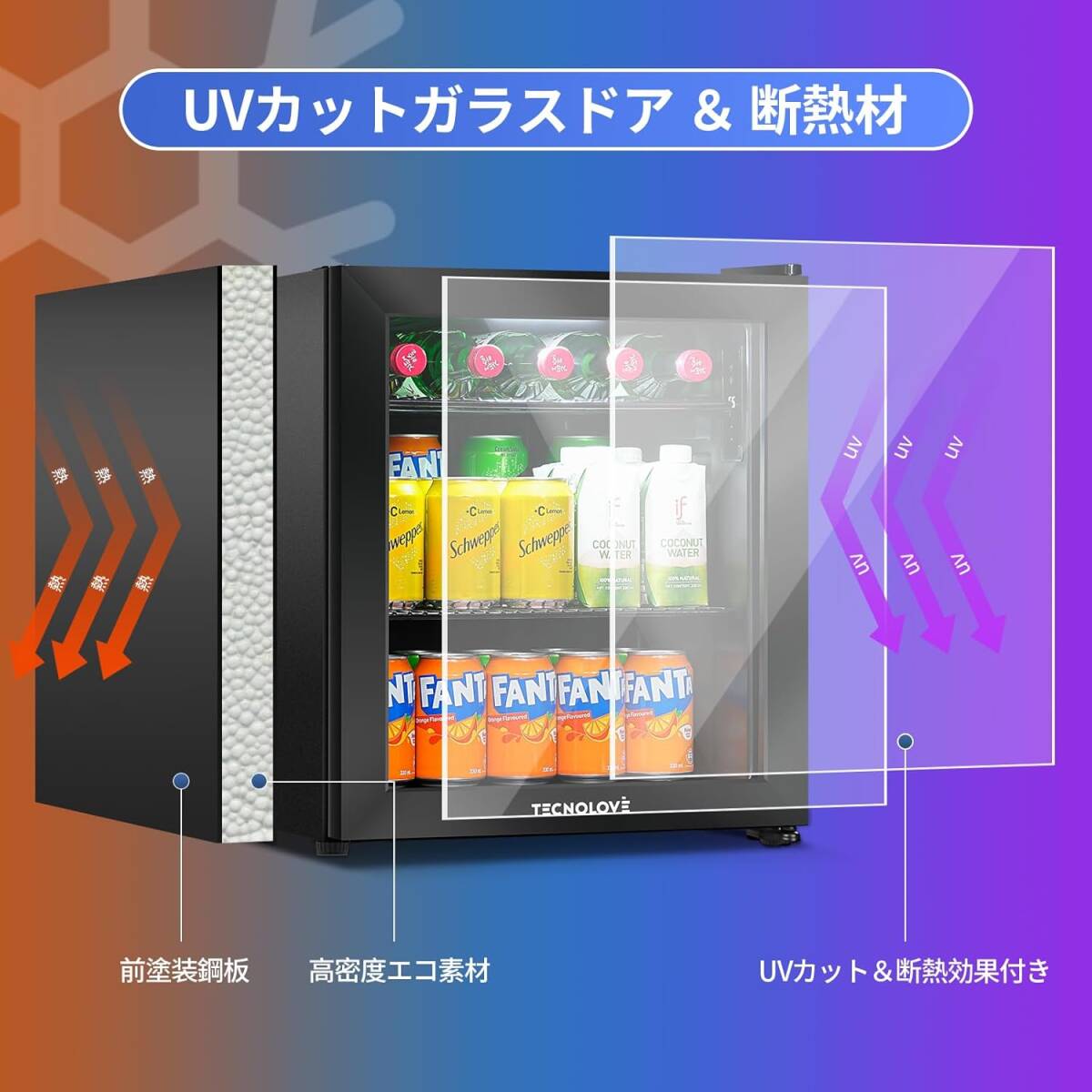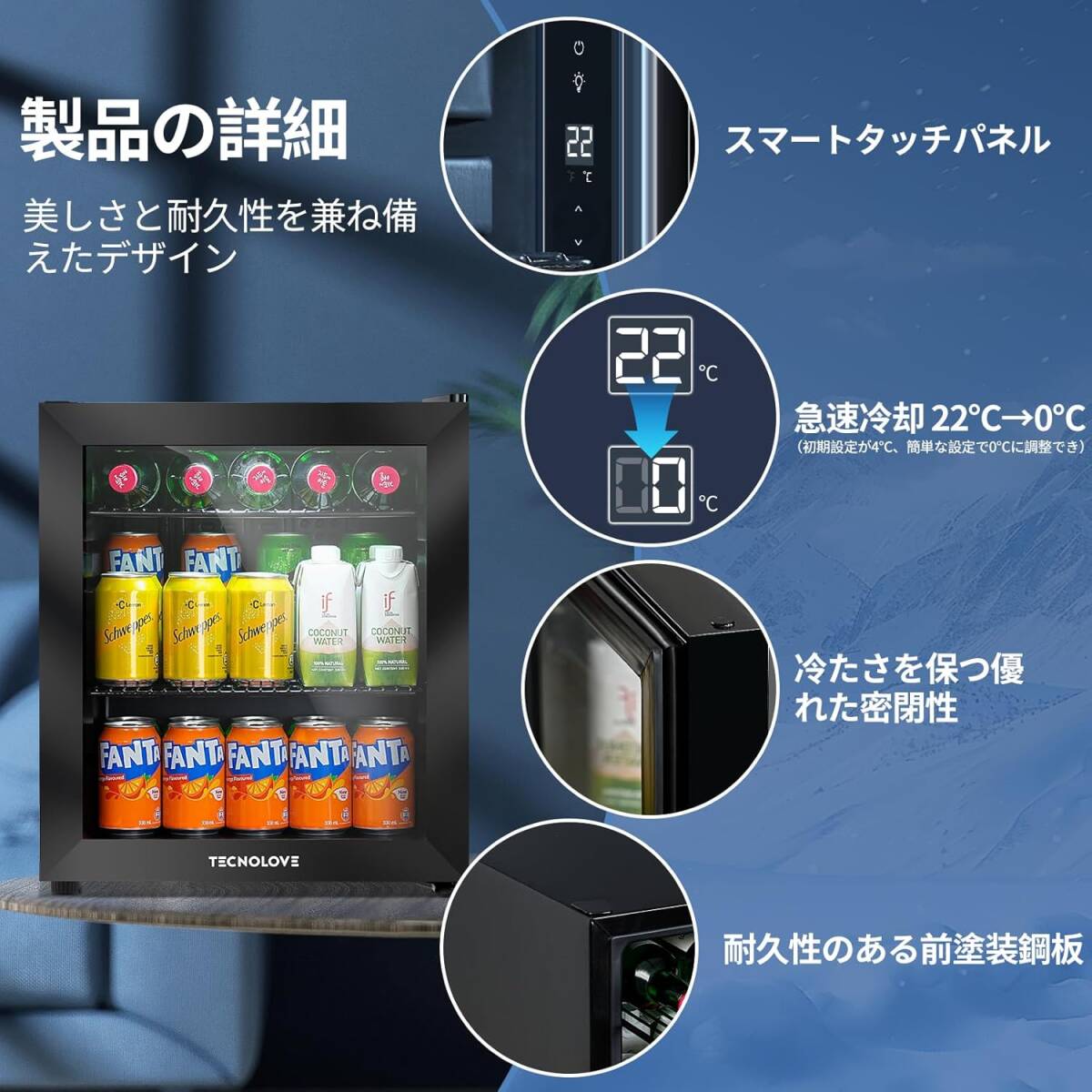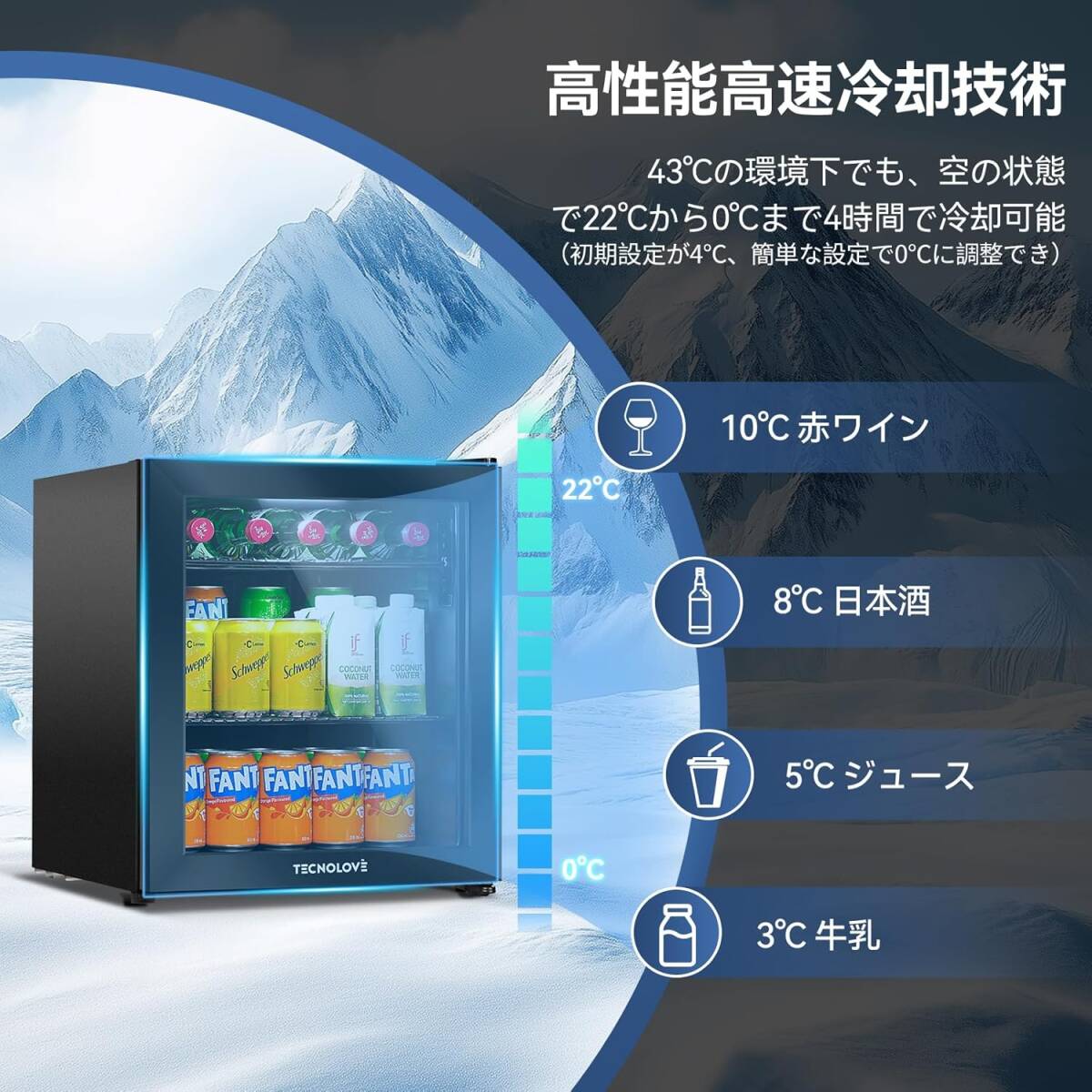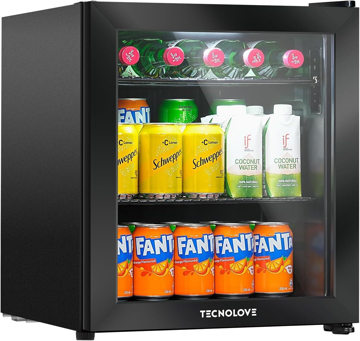 ブラック色 Tecnolove タッチパネル調温 冷蔵庫 46L コンプレッサー式 0~22℃ ドリンク用 直冷式 幅43㎝ 自動霜取り 左右開き