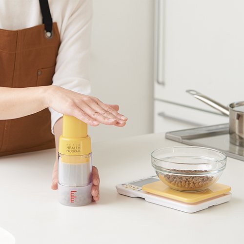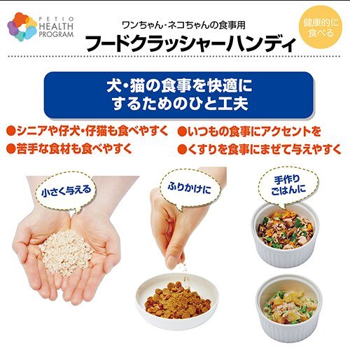 「ペティオ (Petio) ヘルス プログラム フードクラッシャー ハンディ ペット用 1個」▼4903588255335▼(商品説明)・ 1個 (x 1) W25533・・Size:1個 (x 1)・刃が少しずつ回転しながらカットし、押す回数によって細かさを調整。・原産国:中華人民共和国・犬・猫の食事を快適にするためのひと工夫として。・メモリ付カップ2個で使い分けできる。・本体サイズ(幅X奥行X高さ):6.6×6.6×17.8cm説明 商品紹介 犬・猫の食事を快適にするためのひと工夫として。色々なフード・おやつ等を細かくすることで、苦手な食材やシニアや仔犬・仔猫も食べやすいように小さく与えたり、いつもの食事にアクセントとしてふりかけにしたり、手作りごはんにも便利。刃が少しずつ回転しながらカットし、押す回数によって細かさを調整。メモリ付カップ2個で使い分けできる。 使用上の注意 ●本品は犬・猫用です。他の用途には使用しないでください。●人やペットが破片等を誤飲しないように注意してください。万一、誤飲した場合は各医師に相談してください。●本品を正しく使用してください。使用方法の誤りや分解・修理・改造等による事故については、一切責任を負いません。●幼児・子供には使用させないでください。●使用前に破損箇所がないかを必ず確認してください。●破損した場合は直ちに使用を中止してください。●破損の恐れがありますので、強い衝撃や急激な温度変化を与えないでください。●無理な力で使用すると破損する恐れがあります。●アキレスやガム等の硬い食材は使用しないでください。●電子レンジ・オーブン・食器洗浄乾燥機・直火での使用はしないでください。●火気のそばでの使用や保管はしないでください。●幼児・子供・認知症の方・ペットのふれない所に保管してください。(刃について)●本品は鋭利な刃を使用しているため、取扱いには十分注意してください。●刃でケガをする恐れがありますので十分注意してください。●変形・破損した場合は、直ちに使用を中止してください。 使用方法 使用になる前に食器用洗剤で洗浄してください。本体がセットされていることを確認し、テーブル等の水平で安定した場所で垂直に置いてご使用ください。1カップにフードやおやつ等を入れる。※メモリ以上は入れない。※カップに入らない場合や硬めの食材はあらかじめハサミでカット。2本体カバーとカップにスキマがないようセットする。3本体を手でしっかりと支え、本体上部をゆっくりと押し、カットする。※刃が底につくまでしっかりと本体上部を押し下げてから、上に戻し刃を回転させる。※カップをセットしなくても、まな板の上で使用可能。※両手で押さない。4好みの大きさにカットして与える。※色の濃い材料等を使用した場合、着色することがありますが、使用には問題ありません。※食材の形状や状態によって仕上りが変わることがあります。 ご注意(免責)>必ずお読みください ★商品の仕様は予告なく変更する場合があります。★廃棄する場合は、各自治体の指示に従ってください。★品質管理には万全を期しておりますが、お気づきの点がありましたらお客様相談室までお問合せください。