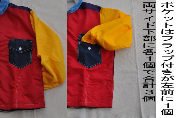 ポケットは左胸にフラップ付が1個、下部両サイドに各1個で合計3個付きます