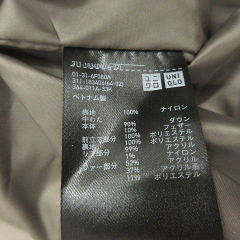 ユニクロ UNIQLO ダウンジャケット フーディー ジップアップ ダウン90% グレージュ L メンズ
