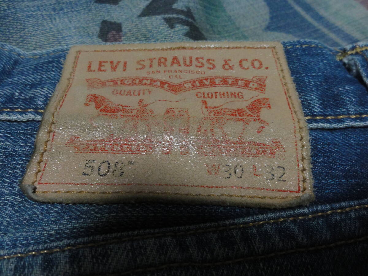 格安リメイク品?レア・LEVI'S 508(リーバイス)・ダメージ加工デニム地・ネイティブインディアン系腿プリント入り高級デザインジーンズ 30になります。