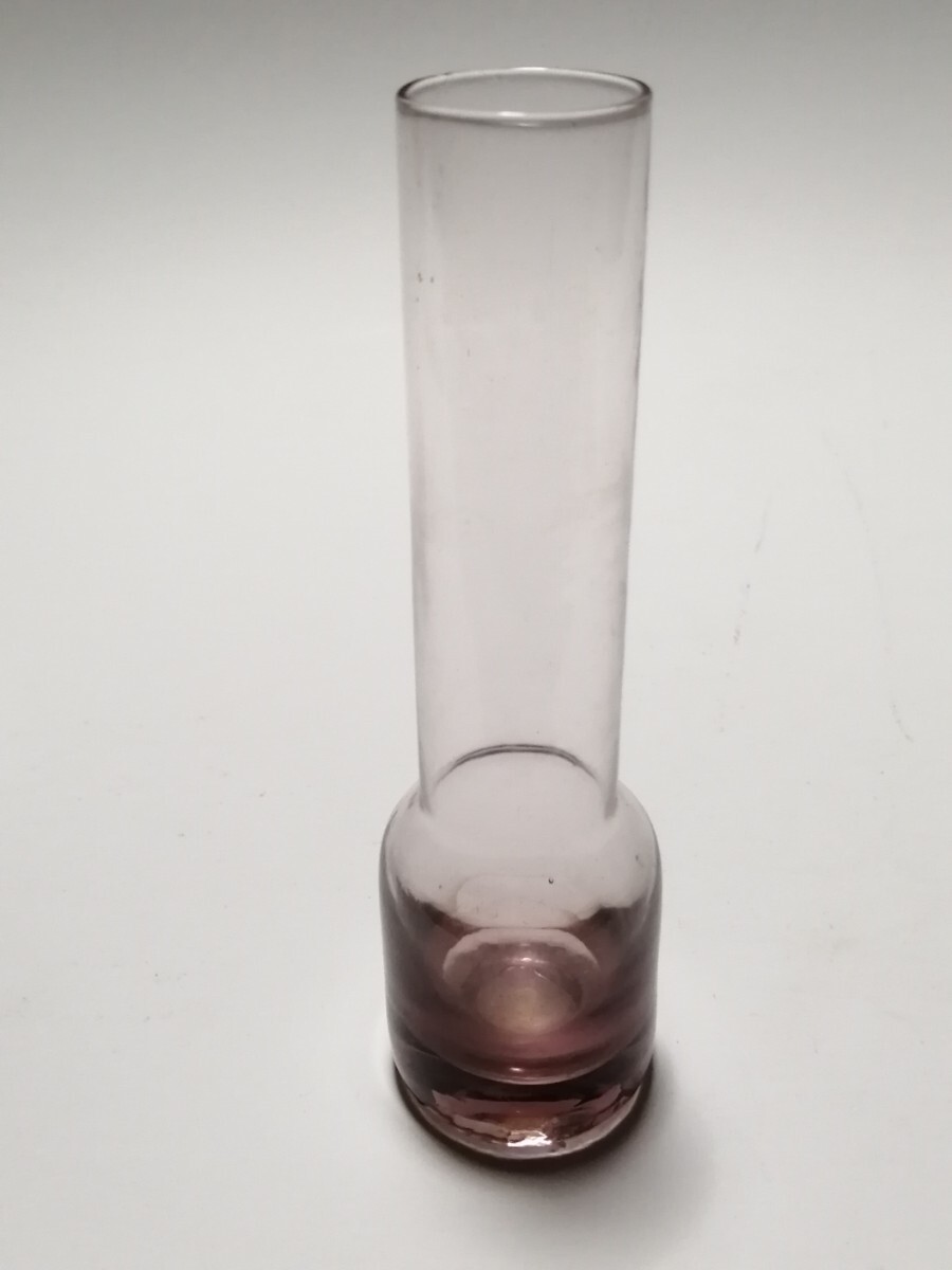 1970年代アメリカの、ガラスの花瓶2個です。細身のフラスコ型で、磨りガラスと紫色の2本です。両方同じサイズで、対になっています。スタイリッシュな製品で色んな使い方ができます。
