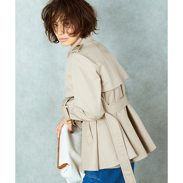 Ray BEAMSのショートトレンチコートです。 一枚でサマになるAライン、上質かつ高密度なインド綿を使用しています。 身頃と背中ににたっぷりと入ったフレアはベルトで表情の変化を楽しめます。