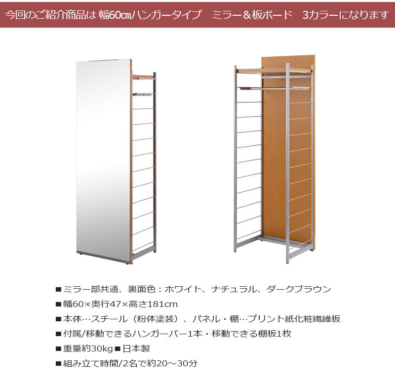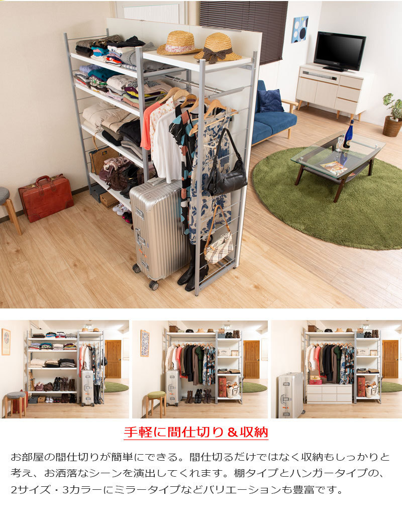 ■商品の仕様/フレーム:スチール(エポキシ粉体塗装)、棚板・ボード :プリント紙化粧繊維板、ハンガーバー:スチール(メッキ仕上げ)