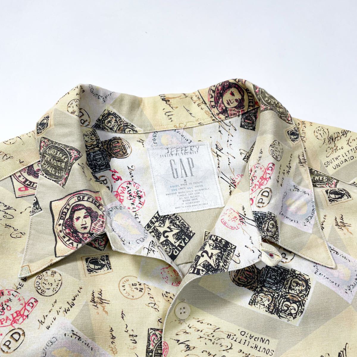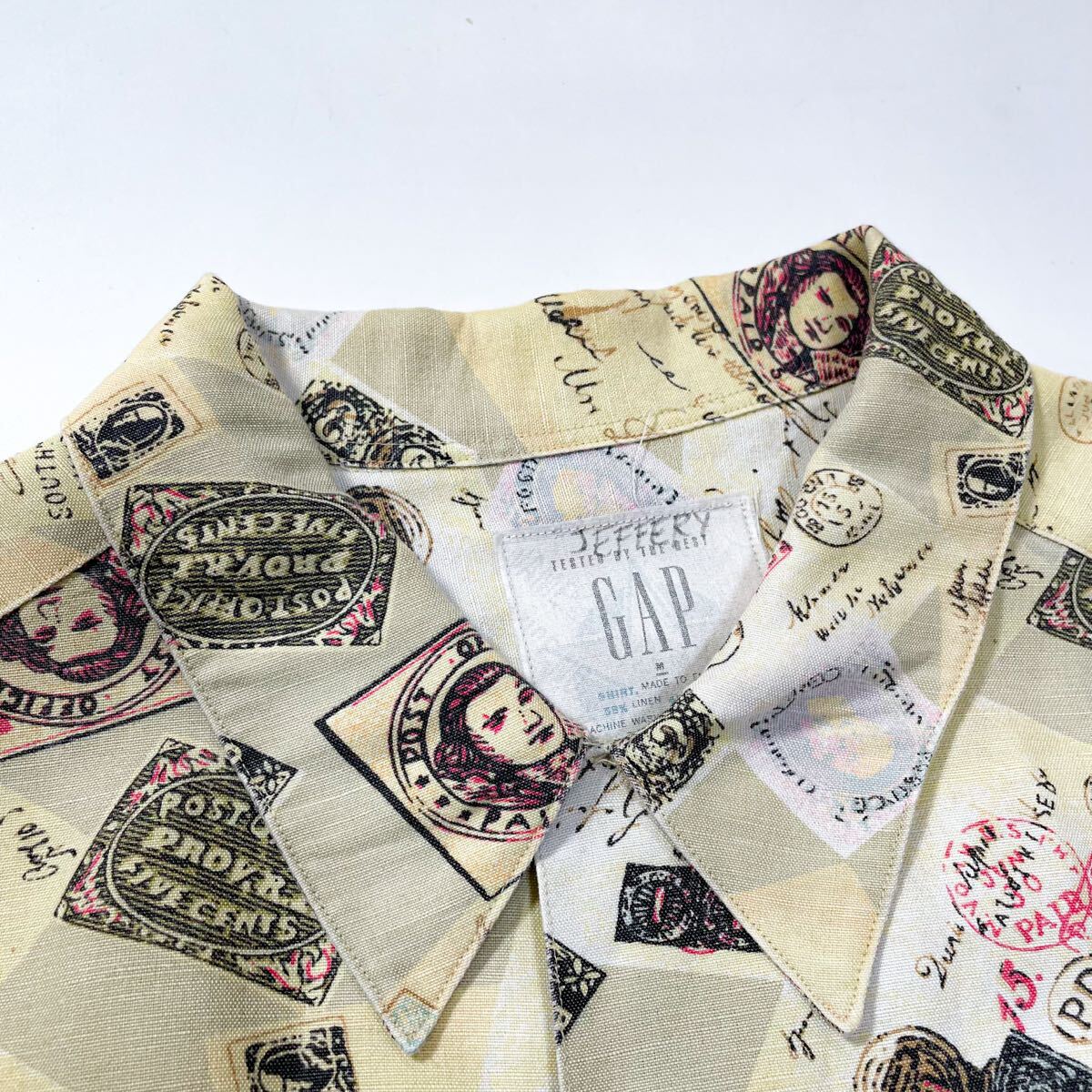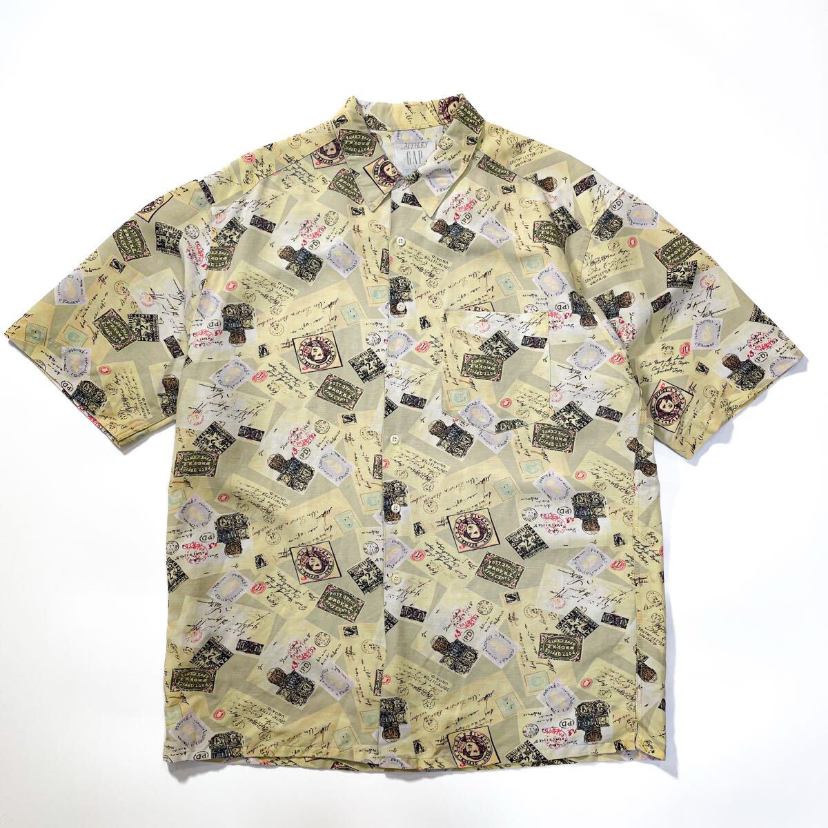 90s 80s GAP ギャップ リネン レーヨン 総柄 切手 オープンカラーシャツ 半袖 アロハ ビンテージ usa M デカタグ レインスプーナー J.crew