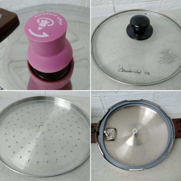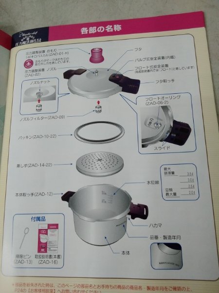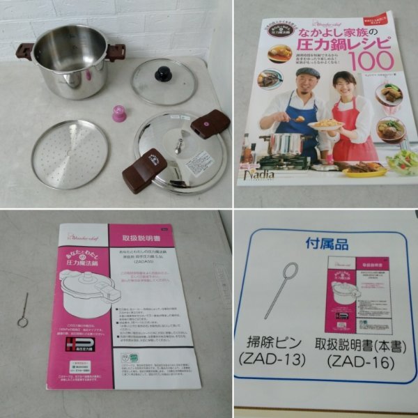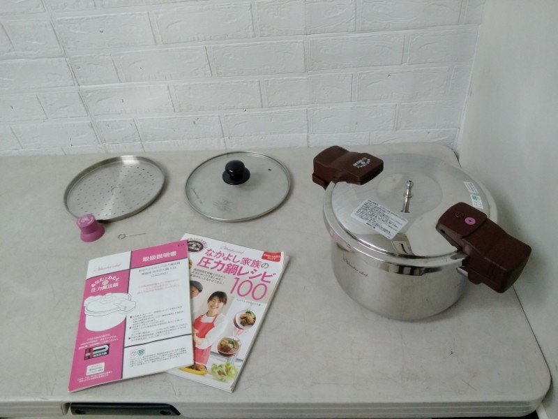 取扱説明書(傷みあり)あり。付属品は全てあり、別売のレシピ本(なかよし家族の圧力鍋レシピ100)が付属します。
