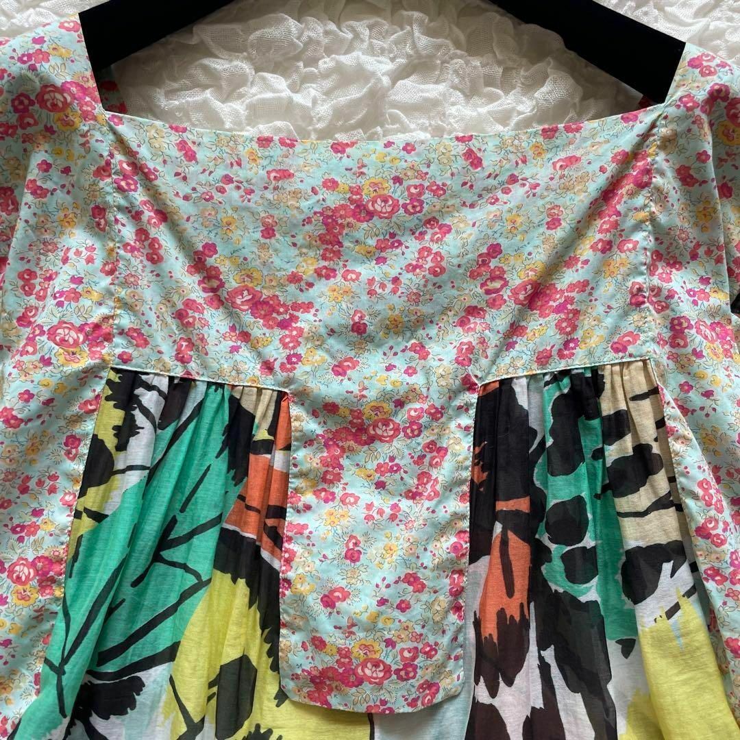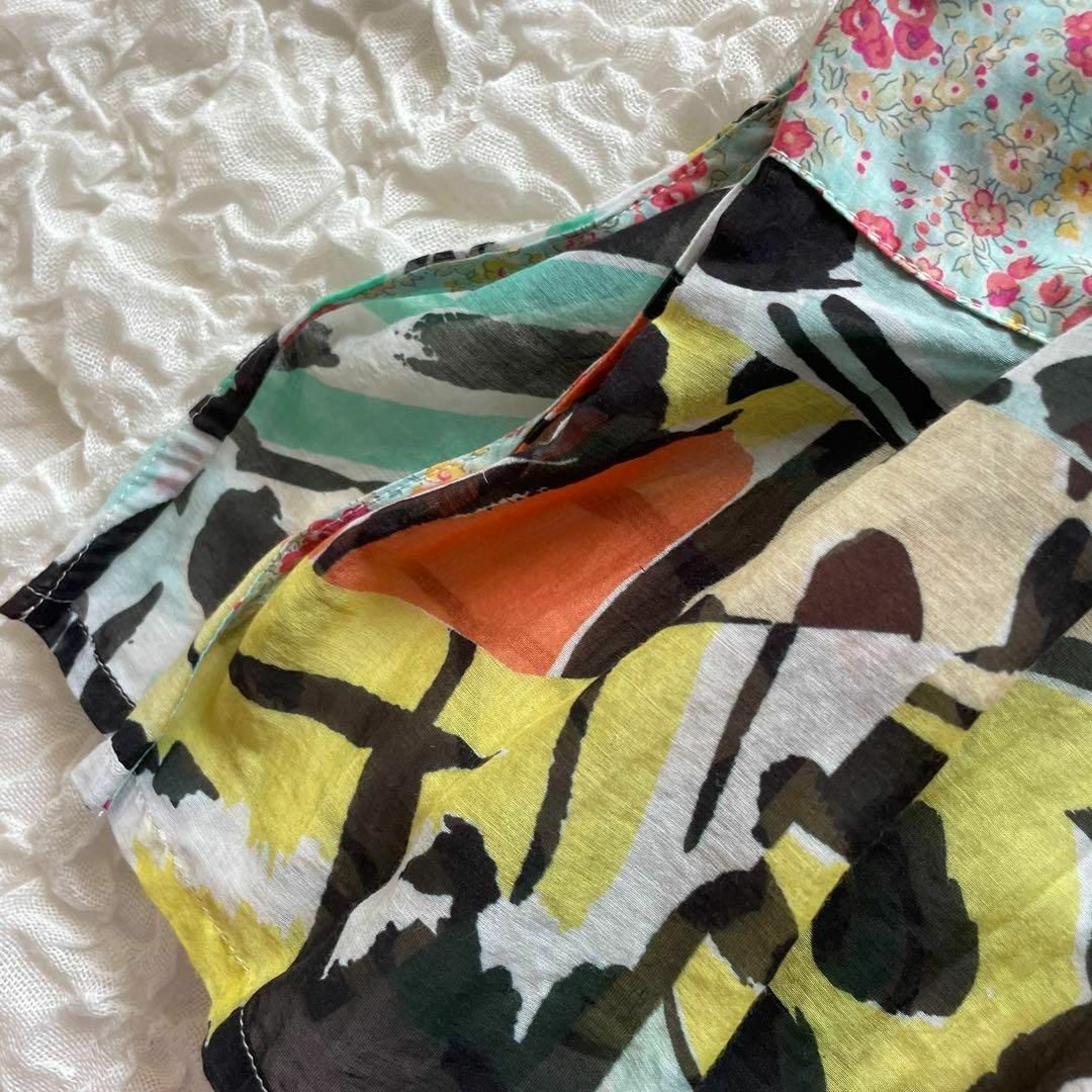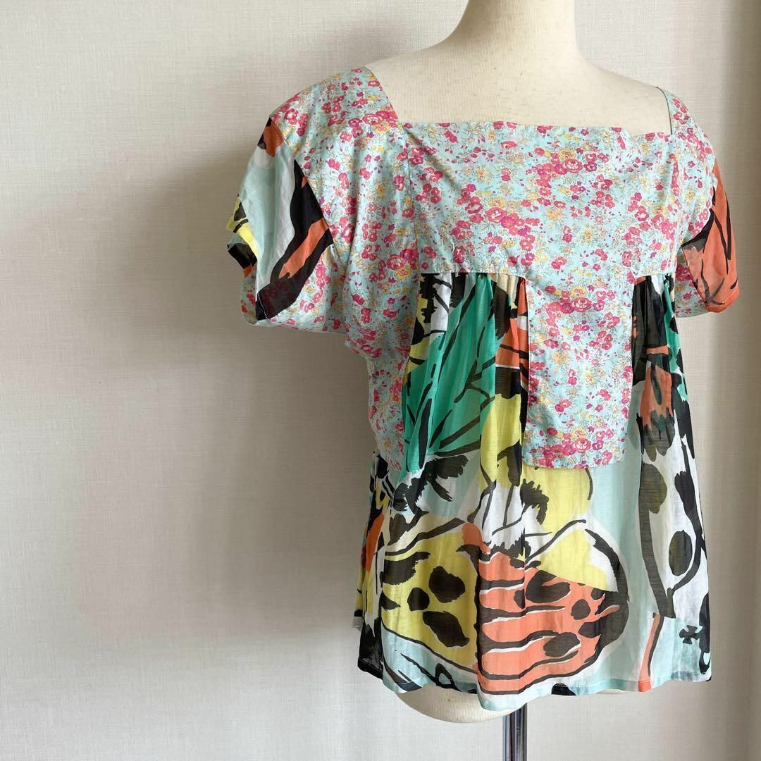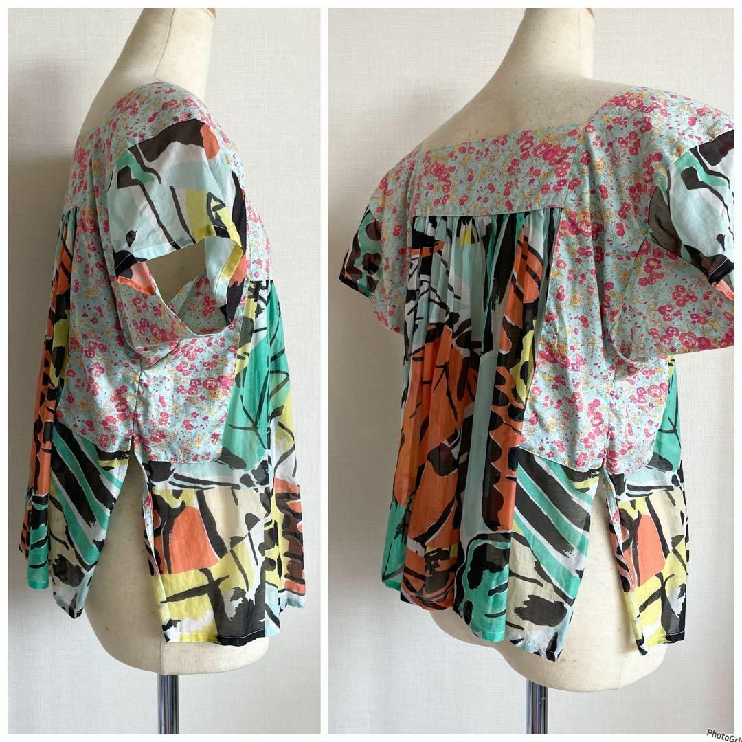 フラワープリント生地と、アバンギャルドな生地の組み合わせ。
