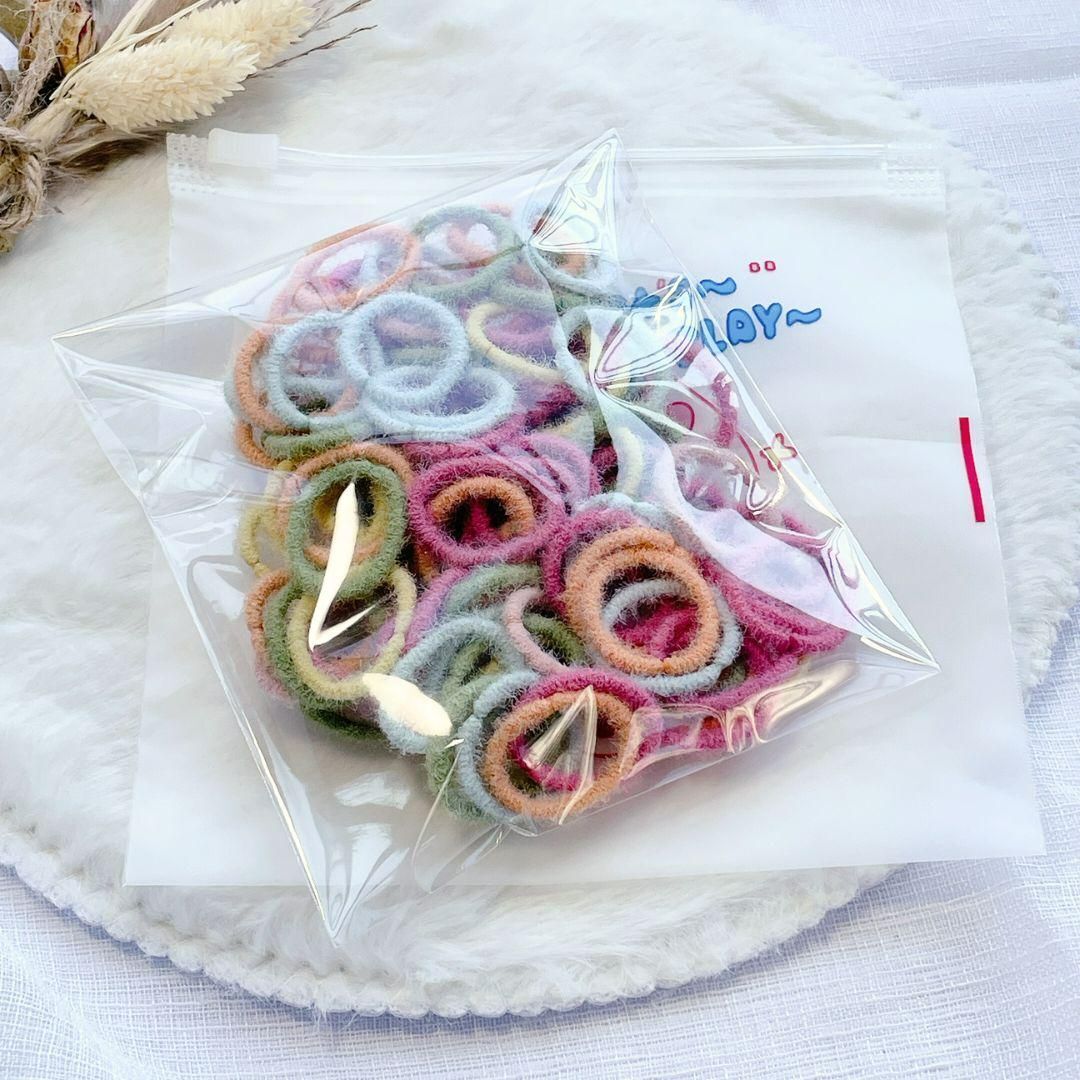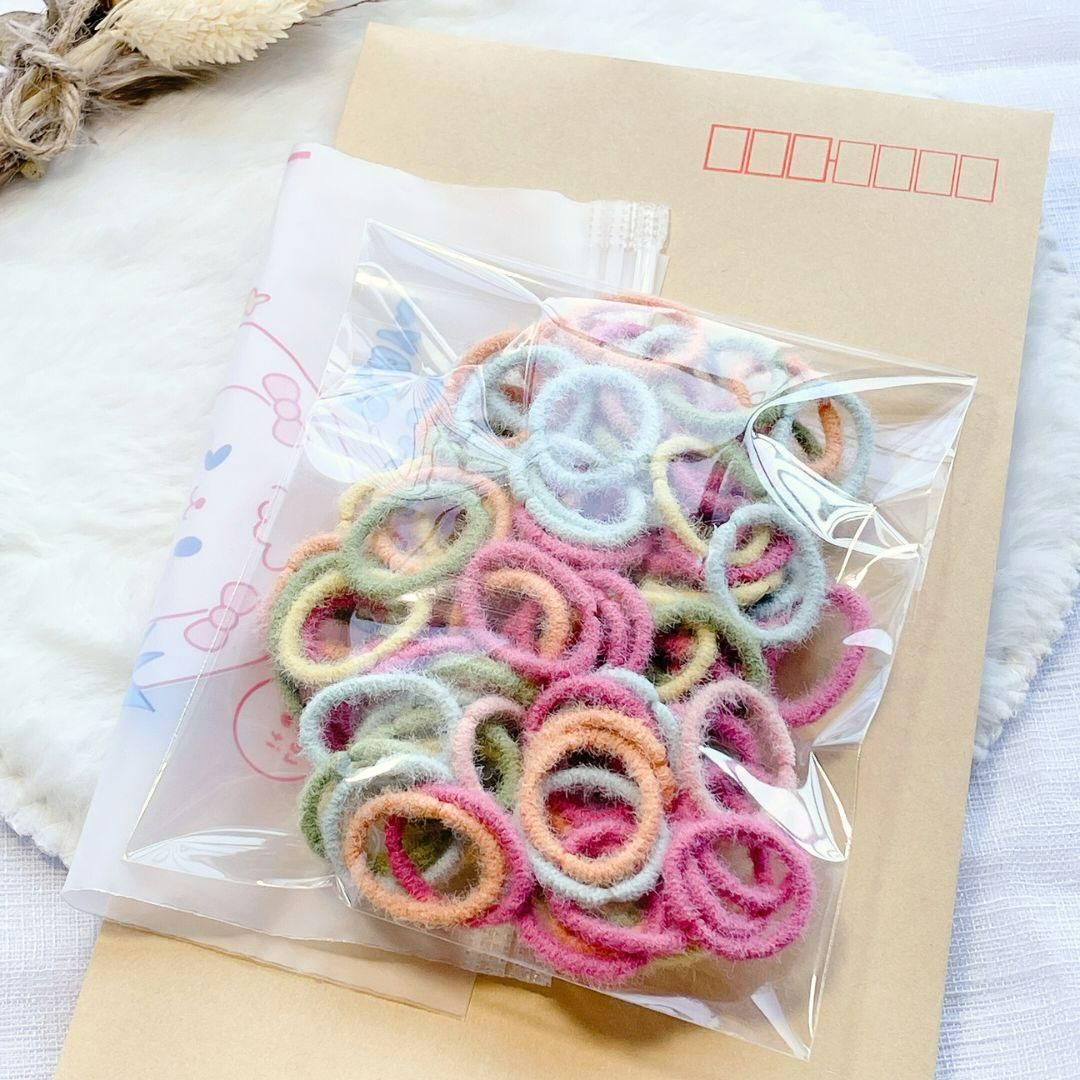 くすみパステル系のやさしい色合いと、毛糸のような“もあもあ”とした質感がかわいいリングゴム100本セットまとめ売りです。