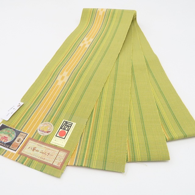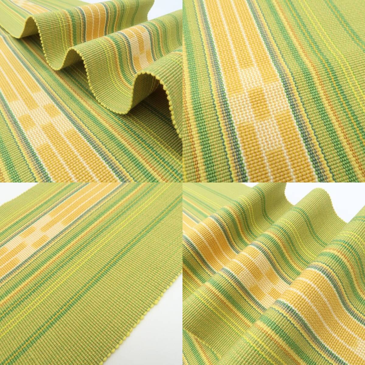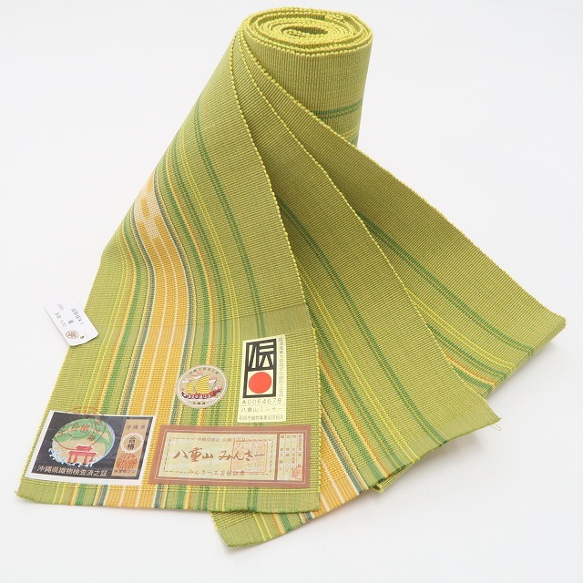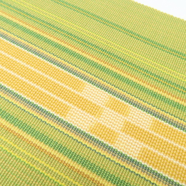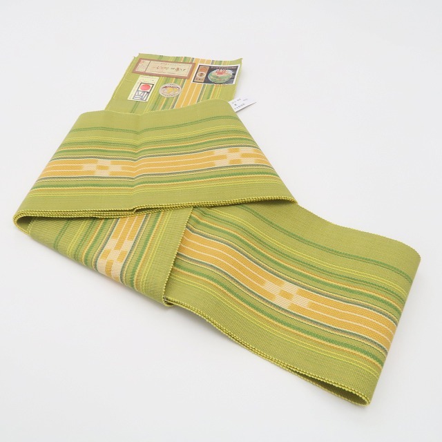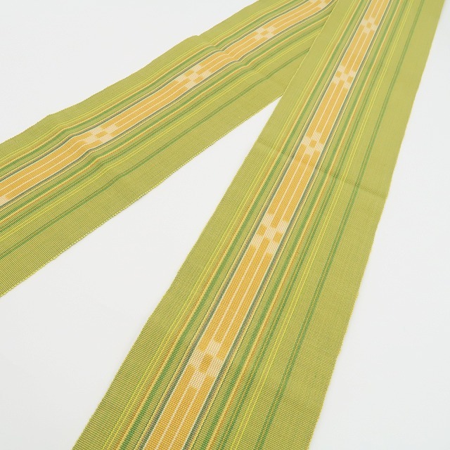 若草色の色糸が創り出す爽やかな風、素朴な綿の素材感にミンサー織独特の四角い絣柄が奏でる織の真心、それは正に歴史が繋ぐ“人と風の物語”、“さぁ!締めて体感!今日から貴女も風の旅人”、その使い勝手の良さに思わず手が伸びる“お気に入り”となることでしょう。