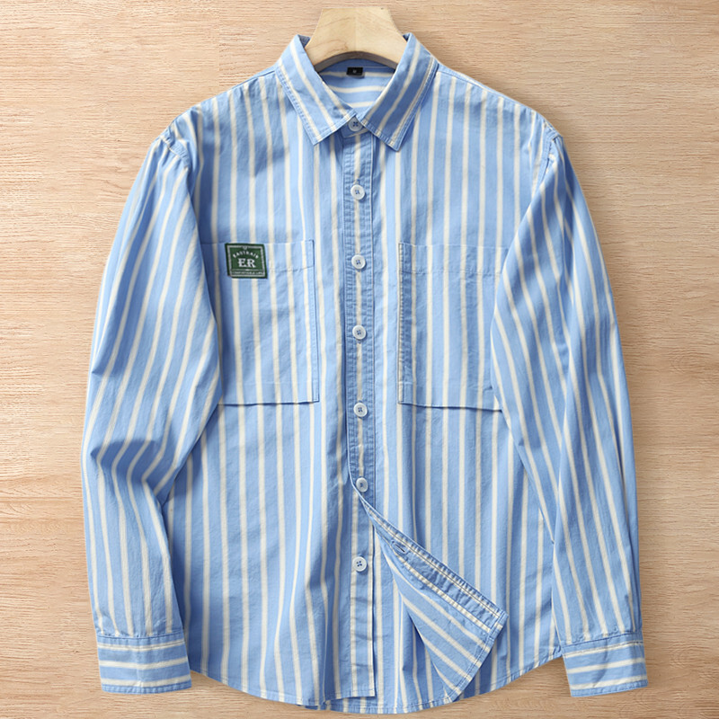 季節の変わり目にぴったりな、綿素材のストライプ長袖シャツ