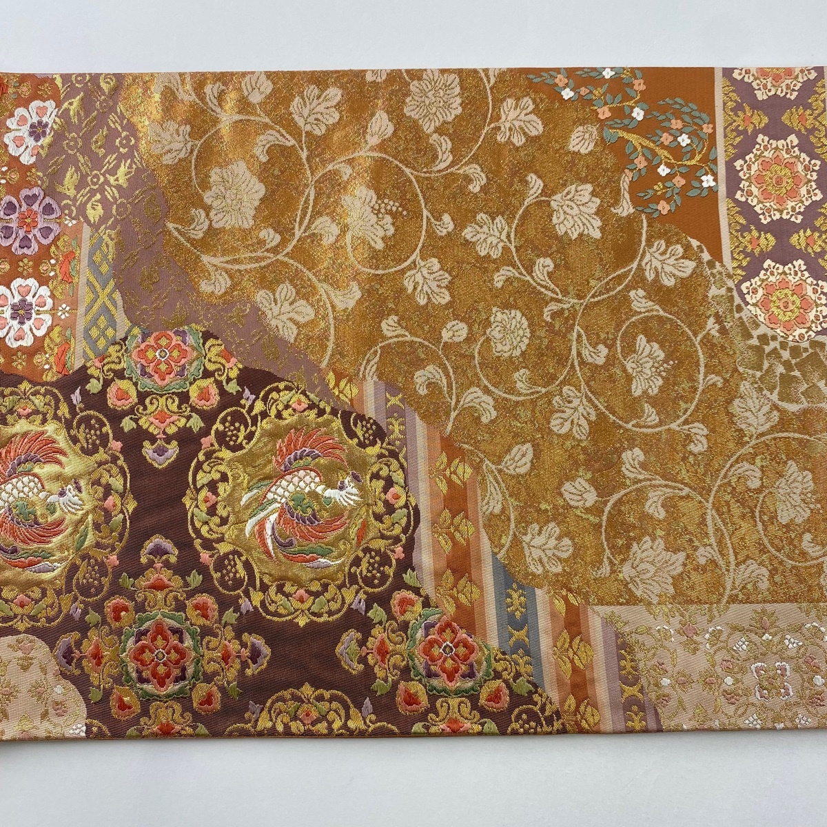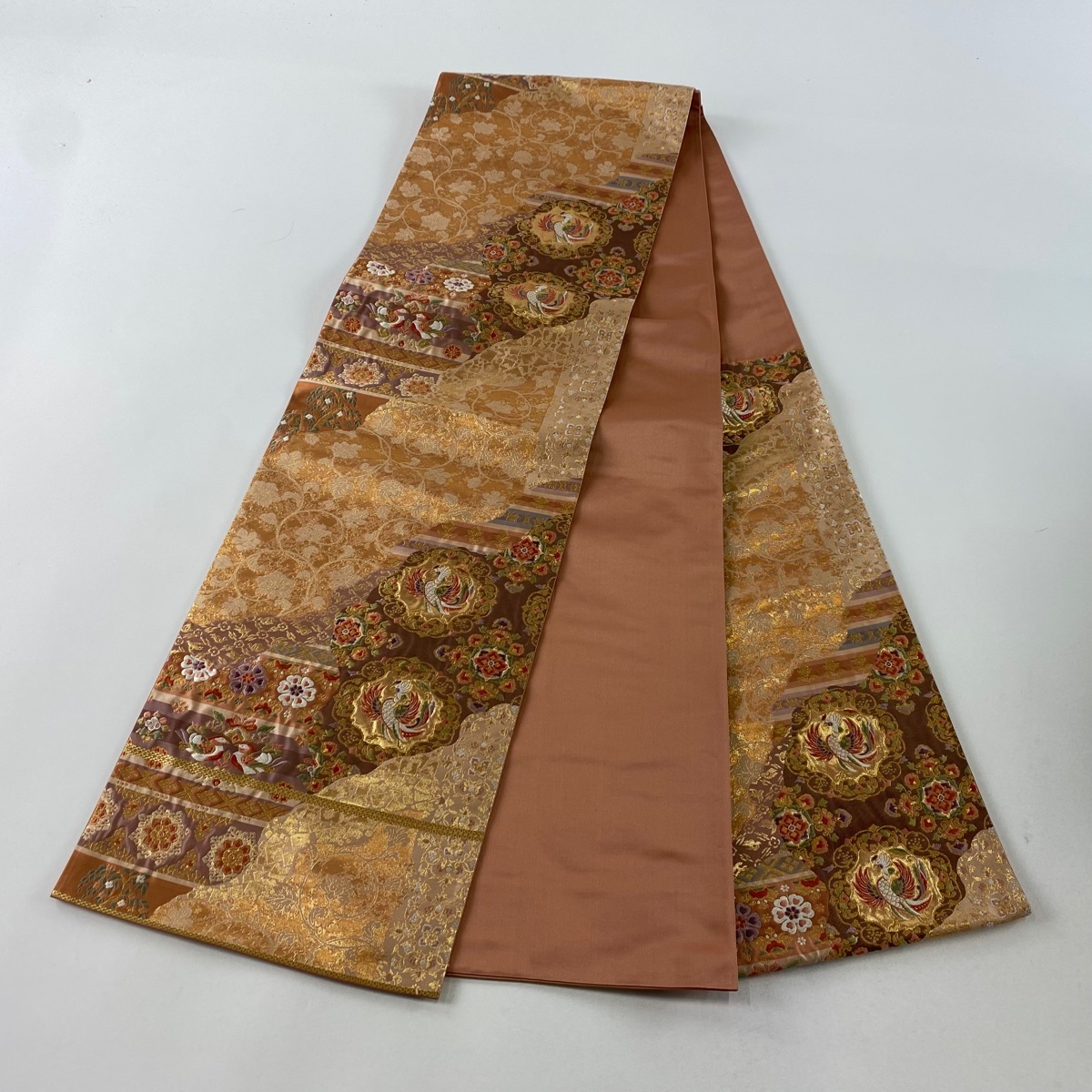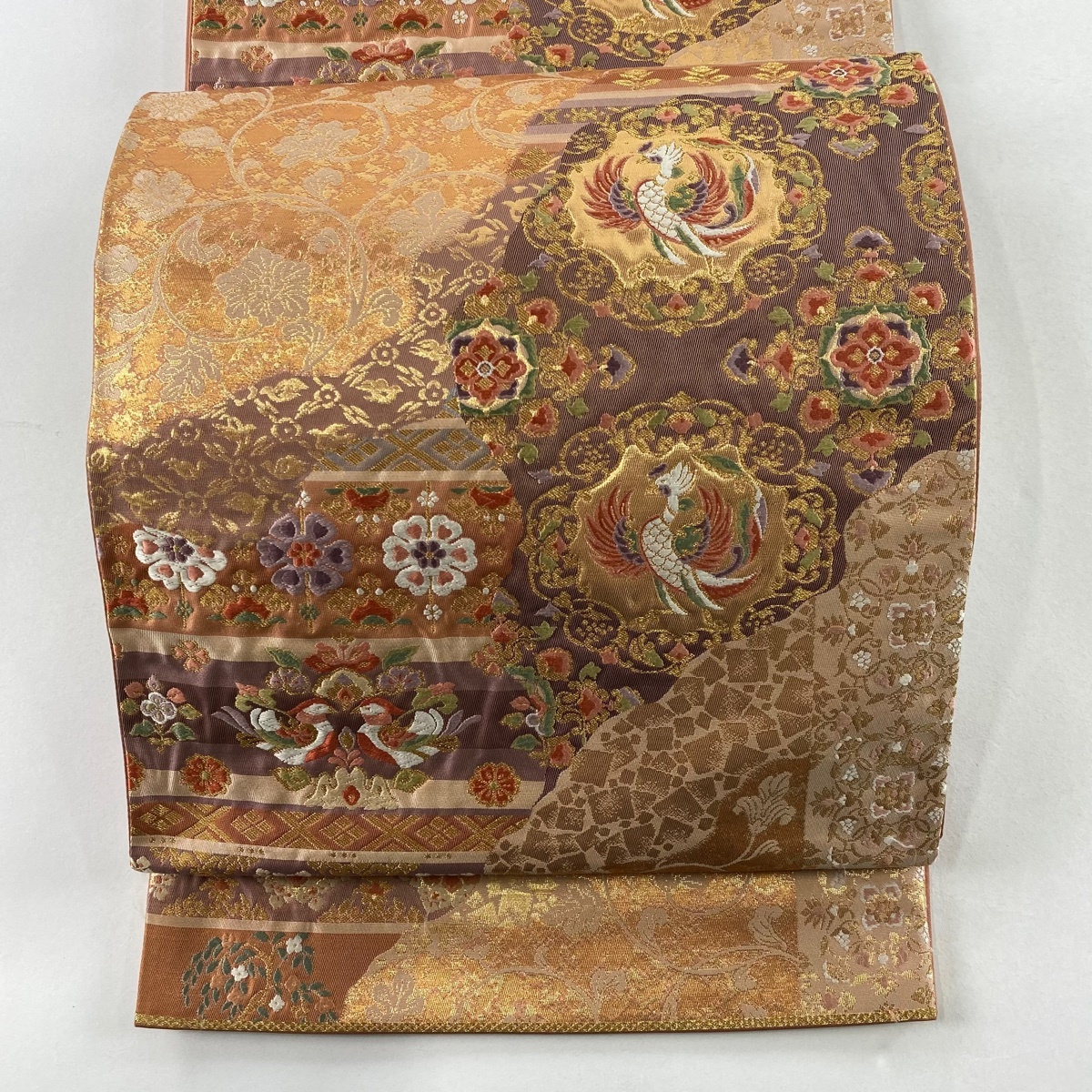 | 袋帯 美品 秀品 関西仕立て 鳳凰 花唐草 金糸 箔 ピンクベージュ 六通 正絹 【中古】 |