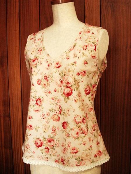 ノースリーブのブラウスを仕立てました。 ルシアンのアンティークローズ 綿100% ベースは、花柄と同系色、シックなピンクベージュ 身ごろはバイアス裁ちで、裾の広がりを抑えボディラインにすんなりと添わせました。 バイアスならではのシルエットと着心地です。 裾には、コットンレースをあしらいました。 深めのVネックが甘くなりすぎるのをセーブ、シャープに♪ ◆サイズ(平置き:cm) 身幅 46 肩幅 33.5 着丈 58 バラ柄大好き!という方に。。。 気に入っていただけたなら嬉しいです♪ | ||||