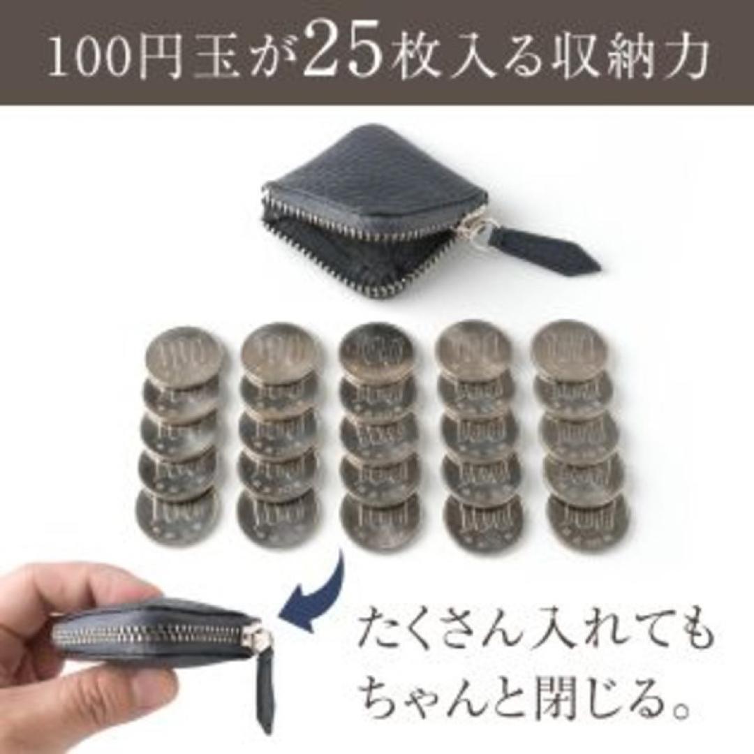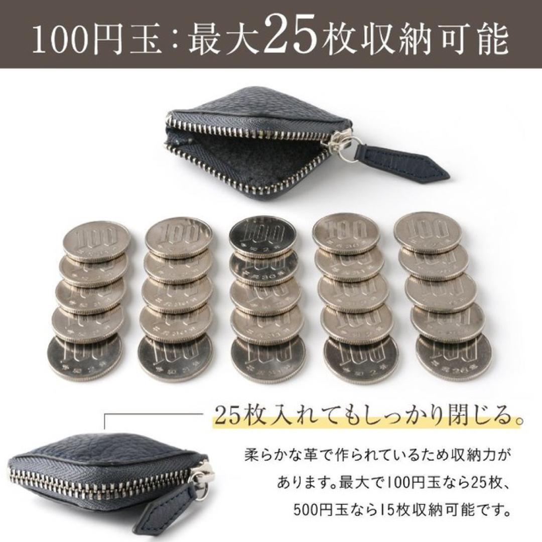 5cm×5cm×1cmの手の平より小さな小銭ケースですが、柔らかな革で作られているため収納力があります。100円玉なら25枚、500円玉なら15枚収納可能です。100円玉を25枚入れてもしっかりファスナーを閉じられます。