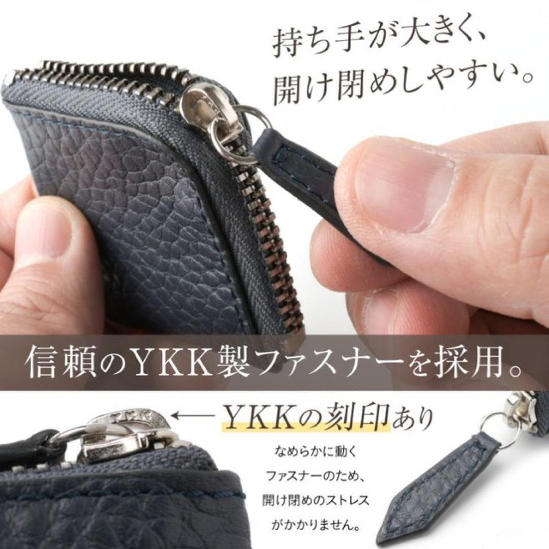 一般的な小銭入れよりも持ち手を大きくし、ファスナーの開け閉めをしやすいようにしています。また、信頼のYKK製ファスナー(刻印あり)を採用しているので、なめらかに動き、開け閉めのストレスがありません。