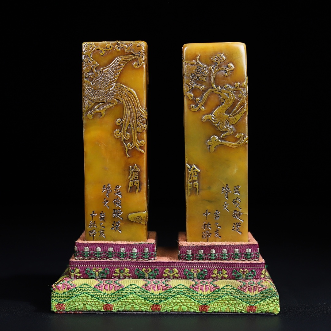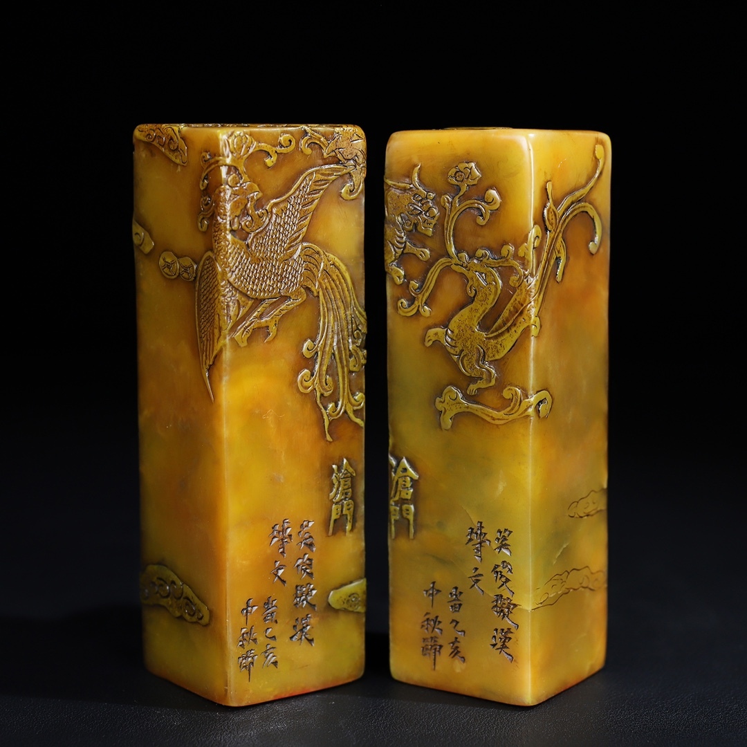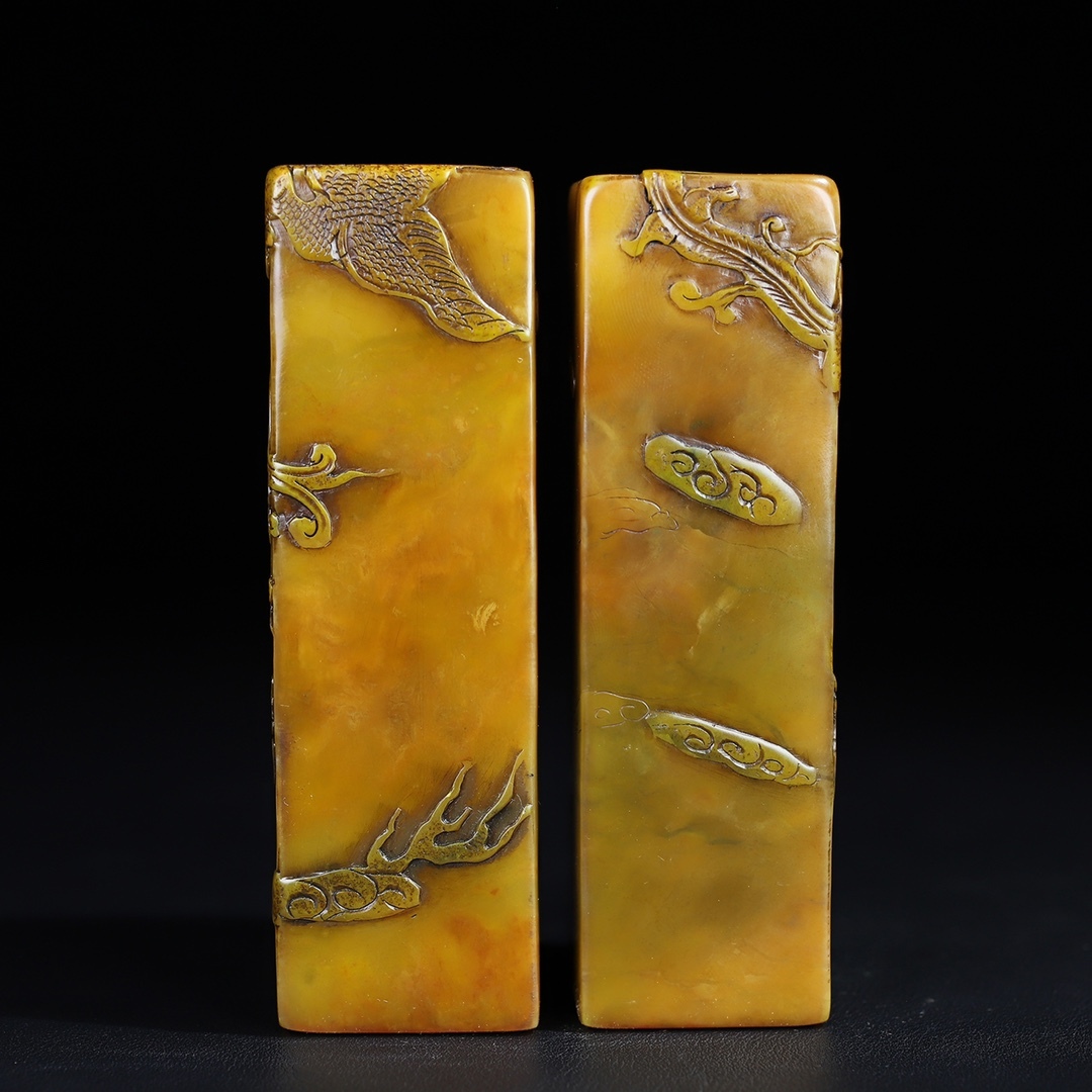 唐物 【清代篆刻家 呉俊】寿山石 田黄石 龍鳳祥 薄意印鑑セット 天然石 手彫 篆刻 古印材 極細工 古美術品 時代物 中国古玩 骨董品 D67