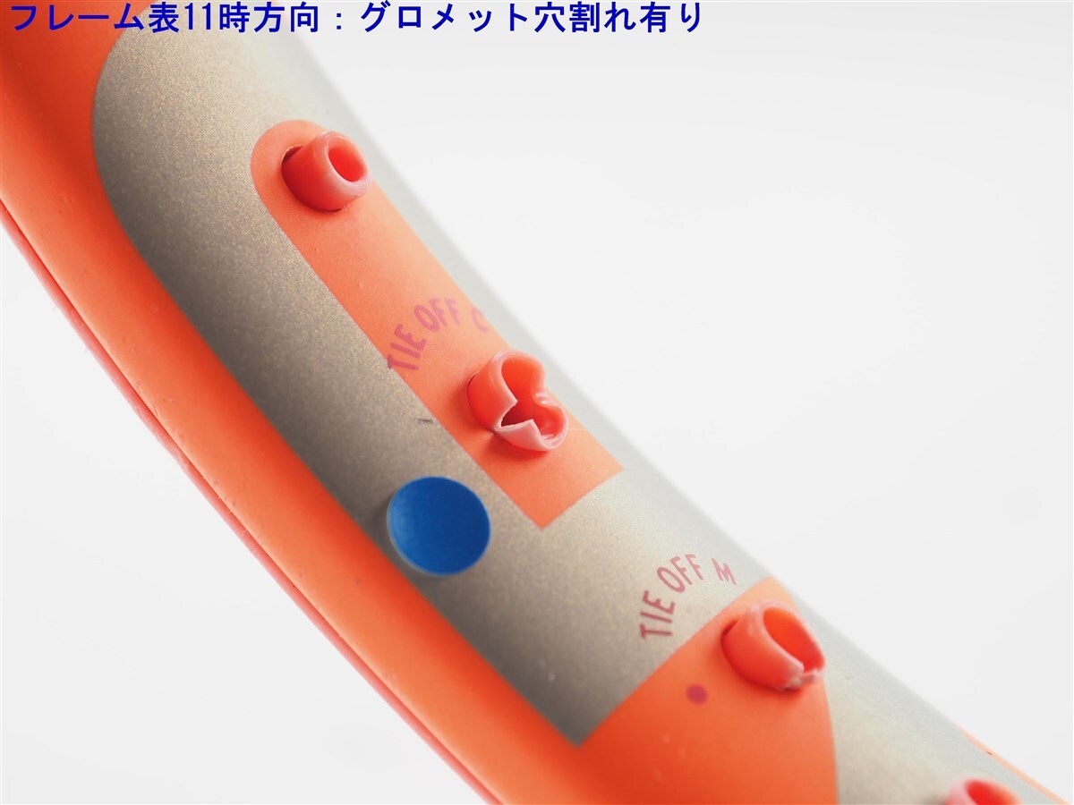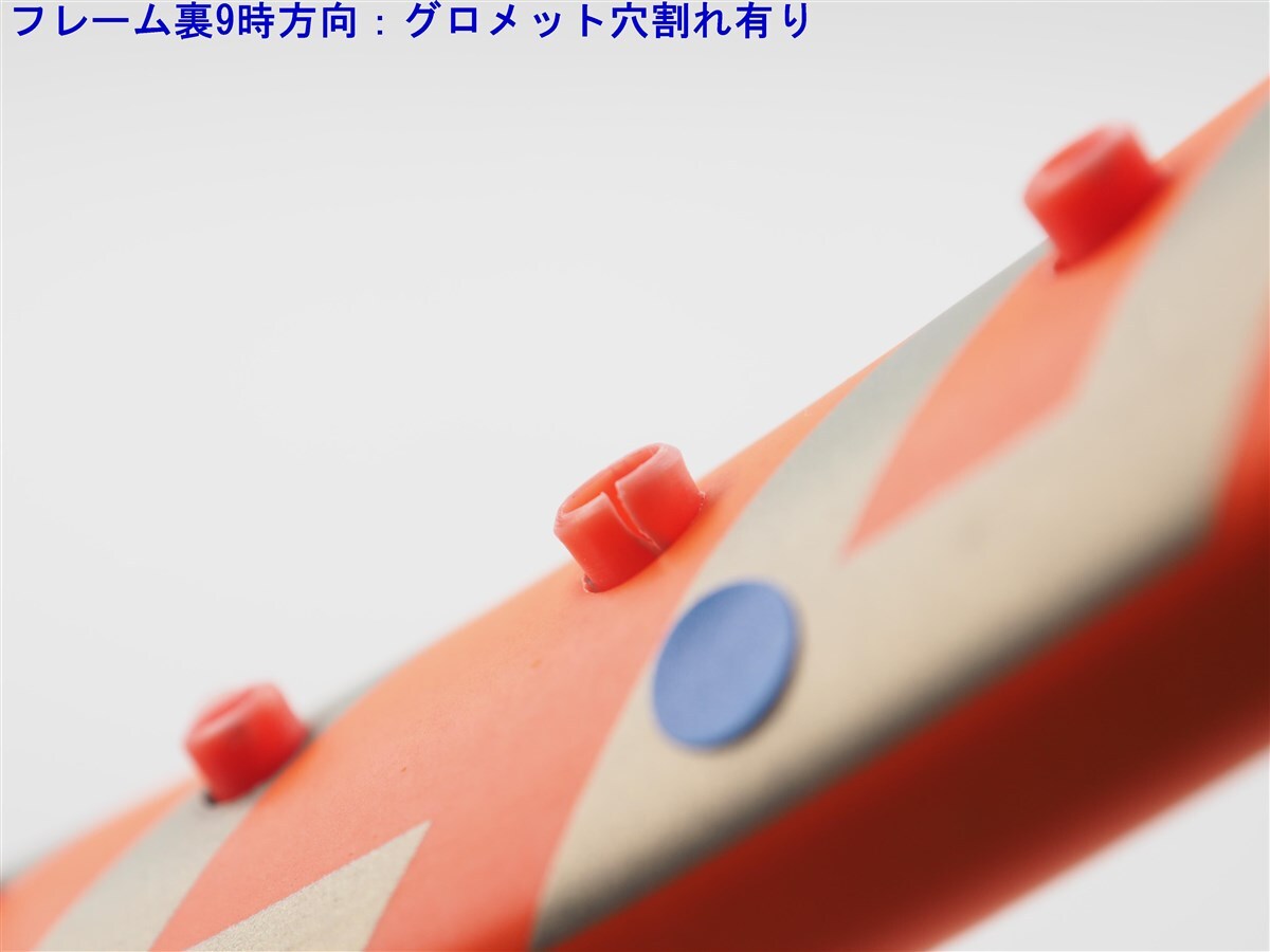 フレームにはキズなどはほとんどありませんが、内側のストリングを通すグロメットが何箇所も亀裂が入って割れている状態です。張り替え時にはチューブなどの補強が必要な場合もございますので予めご了承の上、お買い求め下さいますようお願い致します。