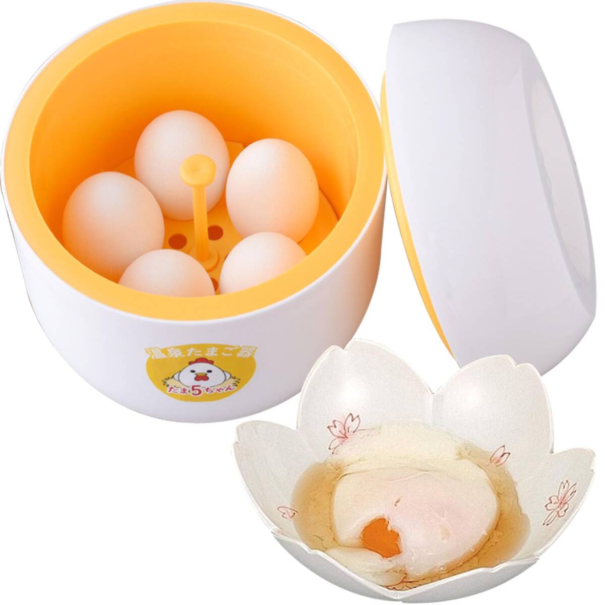 説明 アーネスト「おうちで簡単!温泉たまご器 たま5ちゃん」 【熱湯を注ぐだけで温泉たまごができる】 内装と外装材の間に断熱材と空気層を設け、保温・保冷効果に適した構造のため、熱湯を注ぐだけでカンタンに温泉たまごを作ることができます。 【1度に2~5個まで作れる】 人数が多くても1度に5個まで作れて便利です。 【作り方】 (1)容器の中のたまごスタンドに常温のたまごを縦にしてのせます。 (2)容器に沸騰したての熱湯をたまごスタンドのつまみの下位まで注いでください。 (3)フタをして調理時間を目安に保温します。 (4)冷水に5分ほど浸してから、盛り付ければ出来上がり! 【使い方色々】 サラダ、パスタ、ビビンバ、カレー、めんつゆをかけてそのまま、など色々なアレンジができます。 ●セット内容:本体・蓋・たまごスタンド、取扱説明は箱に記載 ●本体サイズ(約):直径16.5x高さ17.5cm ●重量(約):350g ●材質:本体・蓋・たまごスタンド/ポリプロピレン、断熱材/ポリスチレンフォーム ●耐熱温度:100℃/耐冷温度:-20℃