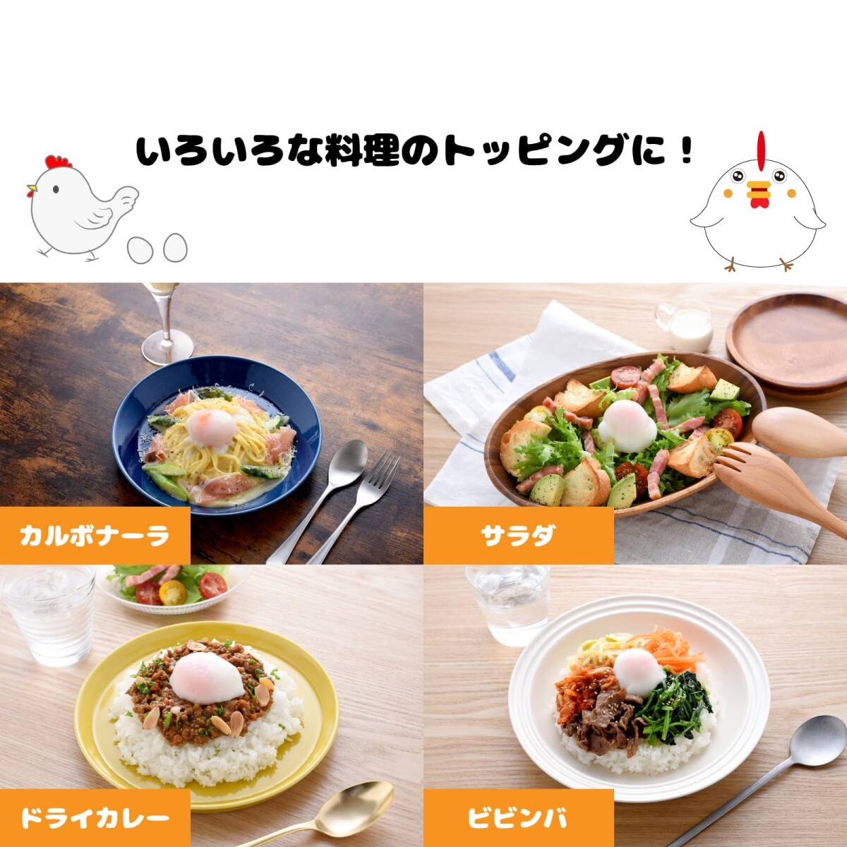 ・【作り方】(1)容器の中のたまごスタンドに常温のたまごを縦にしてのせます。(2)容器に沸騰したての熱湯をたまごスタンドのつまみの下位まで注いでください。(3)フタをして調理時間を目安に保温します。(4)冷水に5分ほど浸してから、盛り付ければ出来上がり!