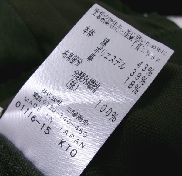 ●素材 ・本体 綿:43% ポリエステル:39% 麻:18% ・布帛部分×分類外繊維(紙):100%