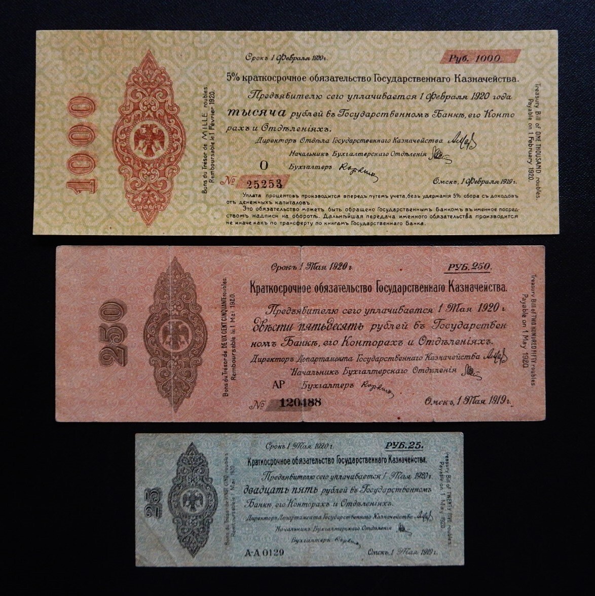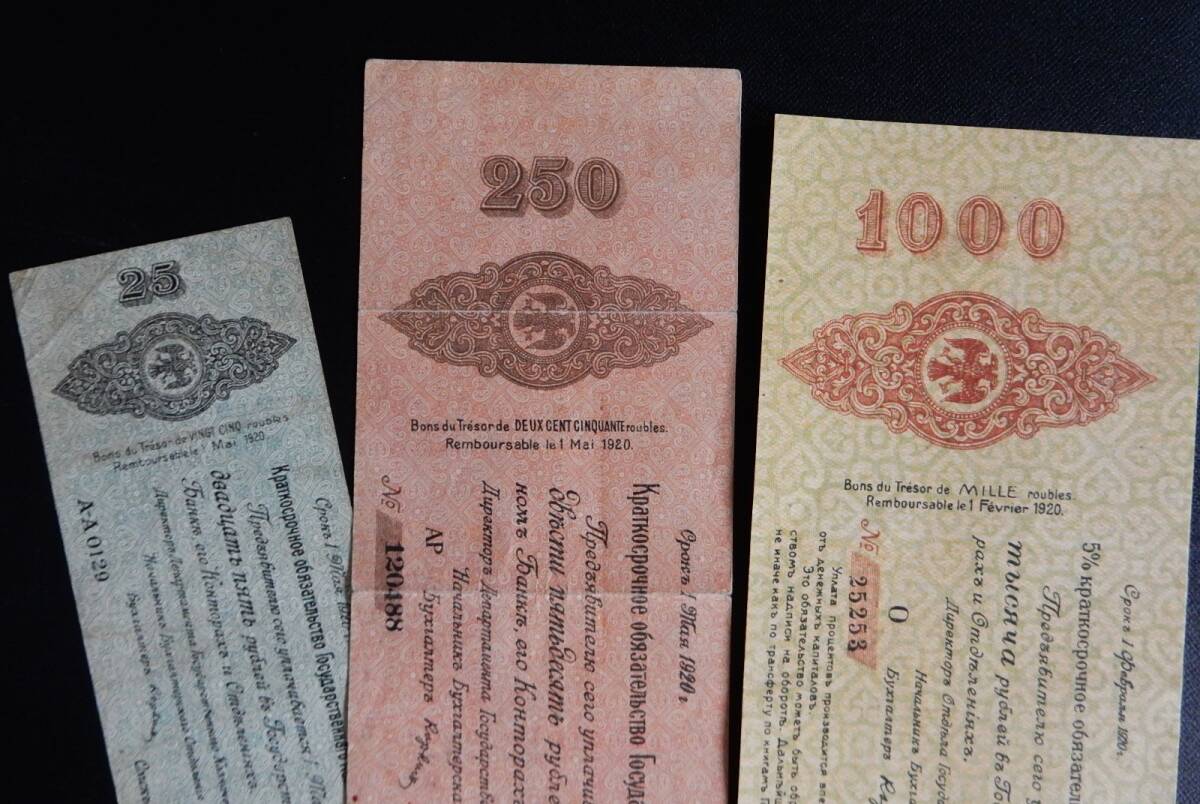 ご覧頂きありがとう御座います♪ ★('-^v)Thanks(v^-')★ 【 ご入札をされる前に必ずお読み下さい! 】 * キャンセル歴、悪い評価が多い方は申し訳ございませんが入札をお控え下さい。 * 最後までご覧いただき全てにおいてご承諾いただける方のみご入札お願い致します。 * いたずらのご入札はお止め下さいませ! ■ 旧ロシア紙幣3枚まとめての出品です。 ■ 1920年 [25/250/1000ルーブル] ■ 1000ルーブルは折れがなく状態はいいと思います。 ■ 25/250ルーブルは折れ有り。 ■ コレクターさんからのお品となりますので当方専門的な事は分かり兼ねます。 ■ お写真でご判断の上ご入札お願いいたします。 ■ ノークレームノーリターンでお願い致します(o^-’)b | |||