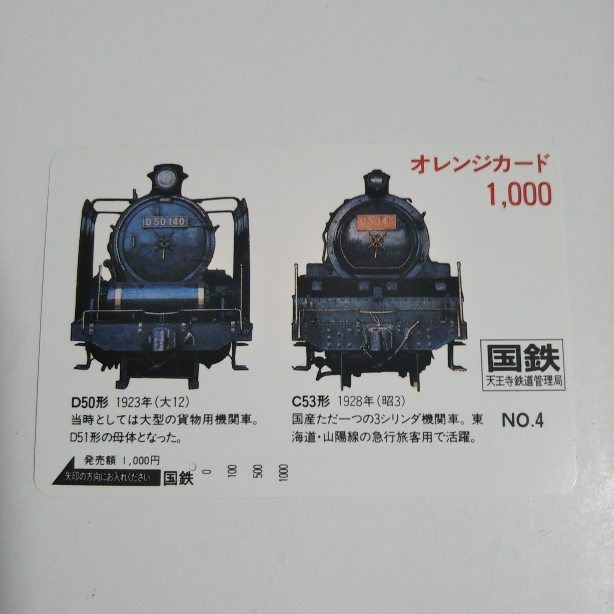国鉄・天王寺鉄道管理局 NO.4 D50形 C53形 オレンジカード 使用済み 1穴