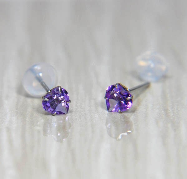 ◆宝石材質:天然アメジスト(ハートシェイプカット) ◆本体材質:14金ホワイトゴールド(K14WG) ◆サイズ:宝石サイズ=縦横約4mm、ポストの長さ=約10mm |