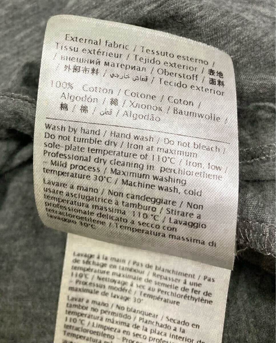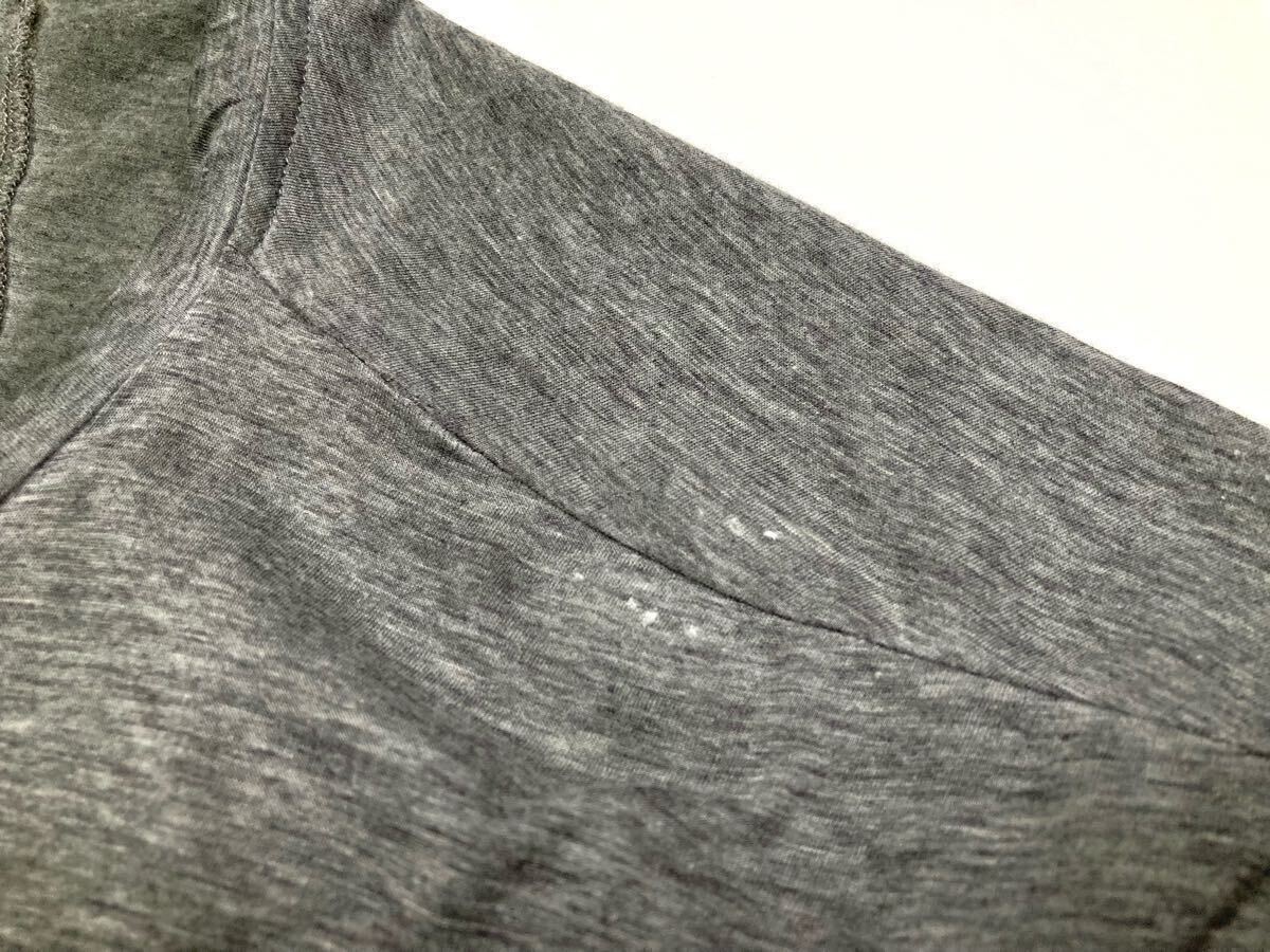 生地が薄手なので、ネック周り・袖口・裾周り・縫い合わせ部分に、着用やクリーニング等によるねじれ・よじれたようなドレープが生じており、生地表面にも立体感や動きが見て取れるような仕様になっています。
