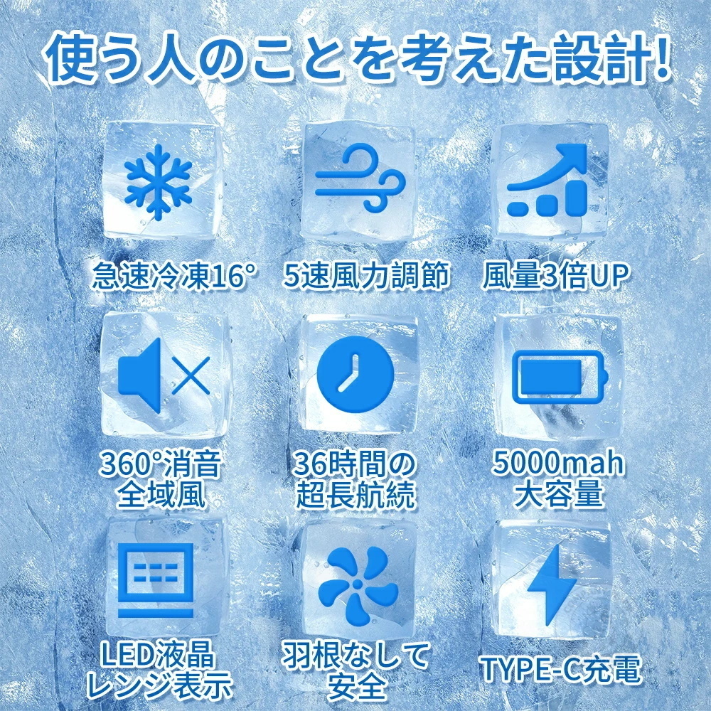 冷却力が大幅に向上し、ネッククーラーや首掛け扇風機の常識を一新します。従来品と比べて、冷却面積が5倍以上(合計7500mm)で、首全体をしっかりとカバーし、瞬時に肌に冷たさを感じます。体感温度は-16℃で、首から全身にかけて強力な冷感を伝え、暑さを和らげます。