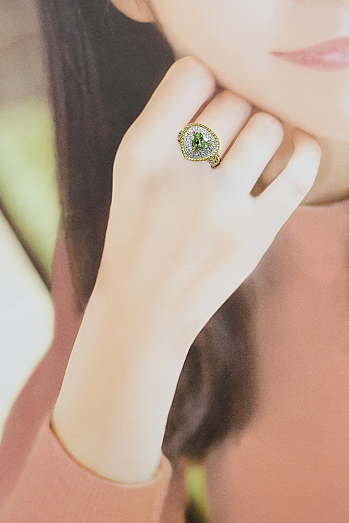 コメントトップにあしらわれたハート型のデマントイドガーネットが爽やかで可愛らしいリングです。ダイヤモンドとミルグレインのキラキラとした輝き、サイドのネコ足のような透かしのデザインまで、クラシカル要素たっぷりでラグジュアリーな印象を高めてくれます。