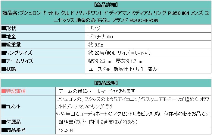 | ■コメント | ブシュロンの、スタッズのようなアイコニックなスクエアモチーフが煌めく、ポワントドディアマンのリングです やや辛口でコーディネートのアクセントにもピッタリな、存在感のあるお品です |